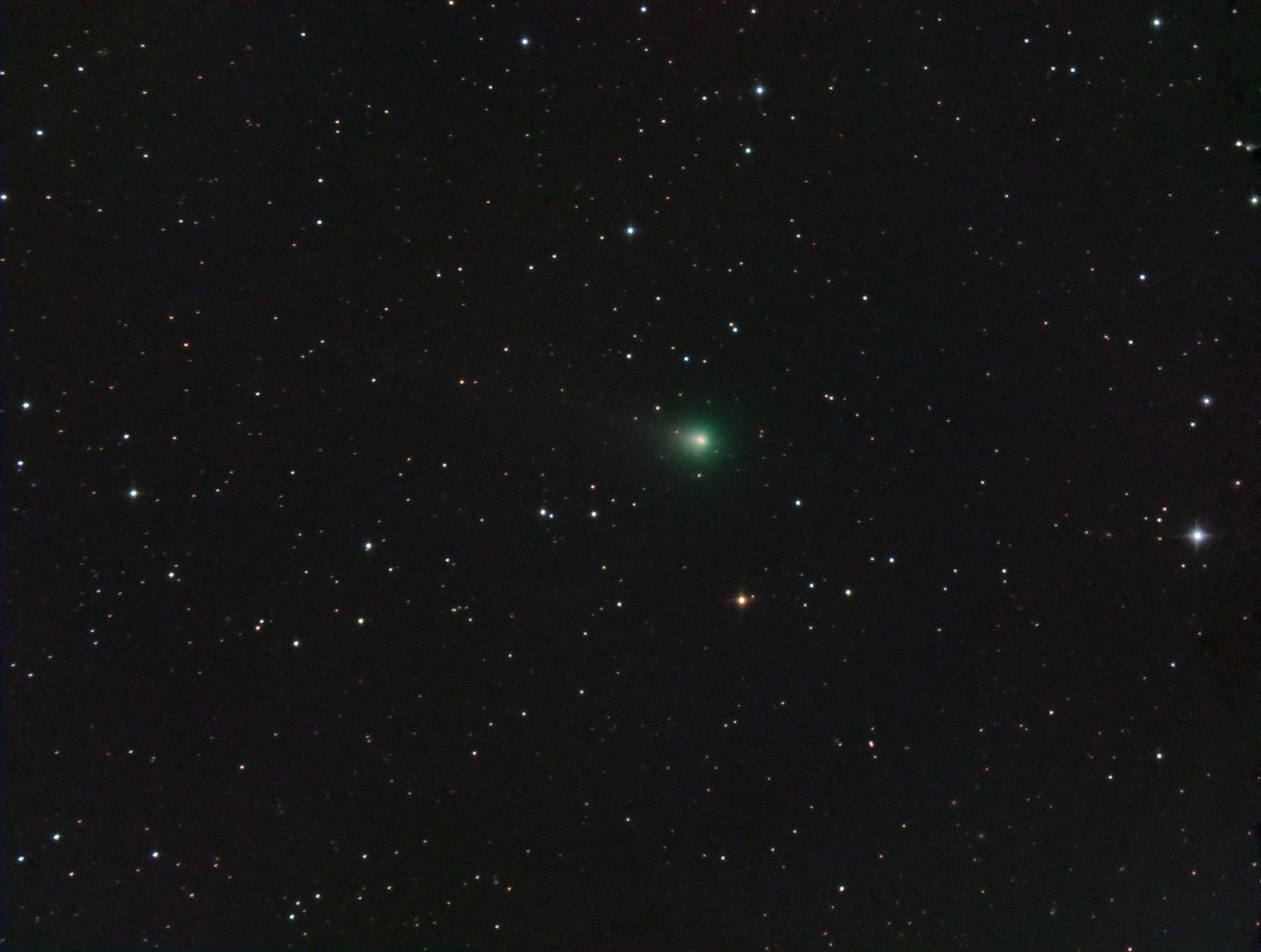 Comet 19P/Borrelly imaged on January 29th, 2022, just at its brightest at magnitude 8.5 during perihelion. With a coma of intense green color and with 5' in angular size. An ionic tail is also observed, which in the monochrome version of the image is seen with a length of at least 38'.
