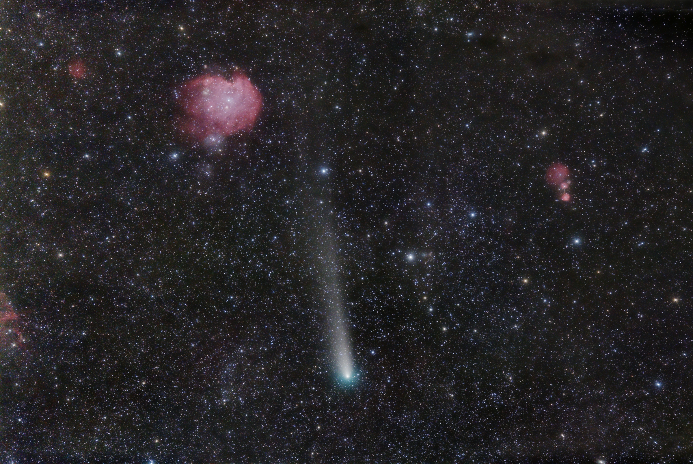 Comet 21P/Giacobini-Zinner on September 18th 2018 moving over the Milky Way background just between constellations Gemini and Orion. Its tail extends with two degree length among ionized hydrogen nebulas, which fill this wide field of 5 by 3.5 degrees. Note the Monkey Head Nebula NGC 2174 in the upper part of the image.