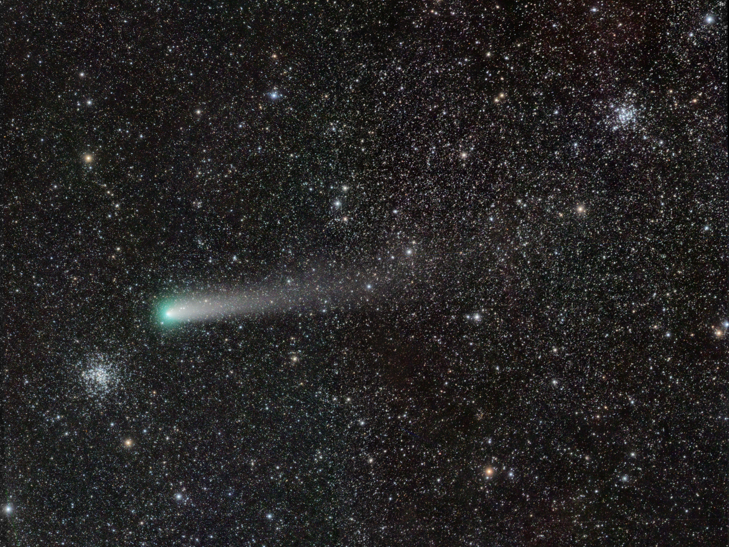 Comet 21P/Giacobini-Zinner imaged on September 10th, 2018, just on its perihelion day at the minimum distance to the Sun. Moreover it almost coincides with its maximum due to the approach to Earth. The present apparition of the periodical comet is the most favorable in decades. Located into constellation Auriga in the middle of the Milky Way on a full starfield and casually passing between the large open clusters Messier 36 at right and Messier 37 at left, also some reddish interstellar dust clouds can be seen mixing between stars.