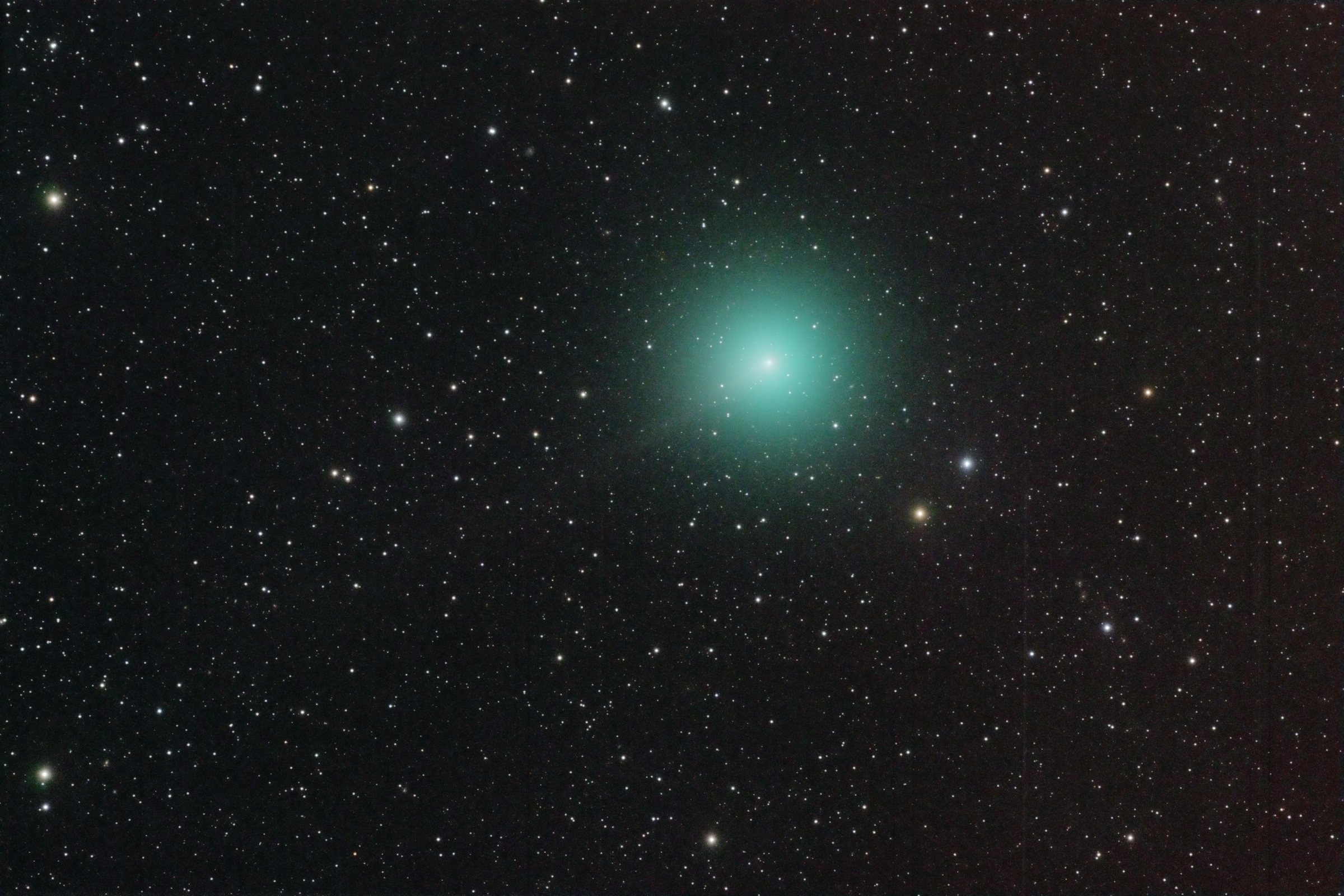 Comet 46P/Wirtanen photographed on November 29th, with a brightness at magnitude 5 is already visible at naked eye from dark skies. In this wide field image the gassy envelope of comet, shaped by diatomic carbon which confer it a greenish color, reaches an angular size of one degree: twice the size of Moon viewed from Earth; the photography also shows a ionic tail which departing from nucleus extends 40 arcminutes toward northeast. Comet Wirtanen will increase even more its brightness and apparent size unto its maximun approaching to Earth at middle December.