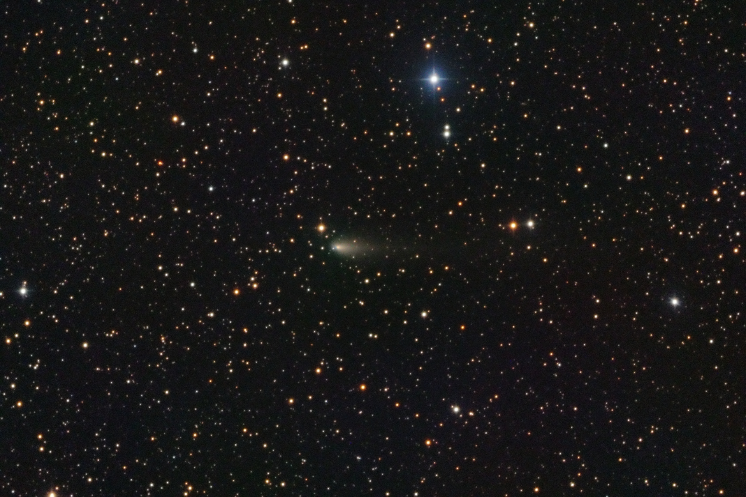 Comet 4P/Faye imaged on September 11, 2021 during its closest approach to the Sun, with a brightness that has increased to magnitude 10,8 seems to have lost structures inside its 2,5' angular size coma, while its tail has been extended to a length of 9' toward west. This comet will continue at this brightness until the end of October as it continues to approach Earth.