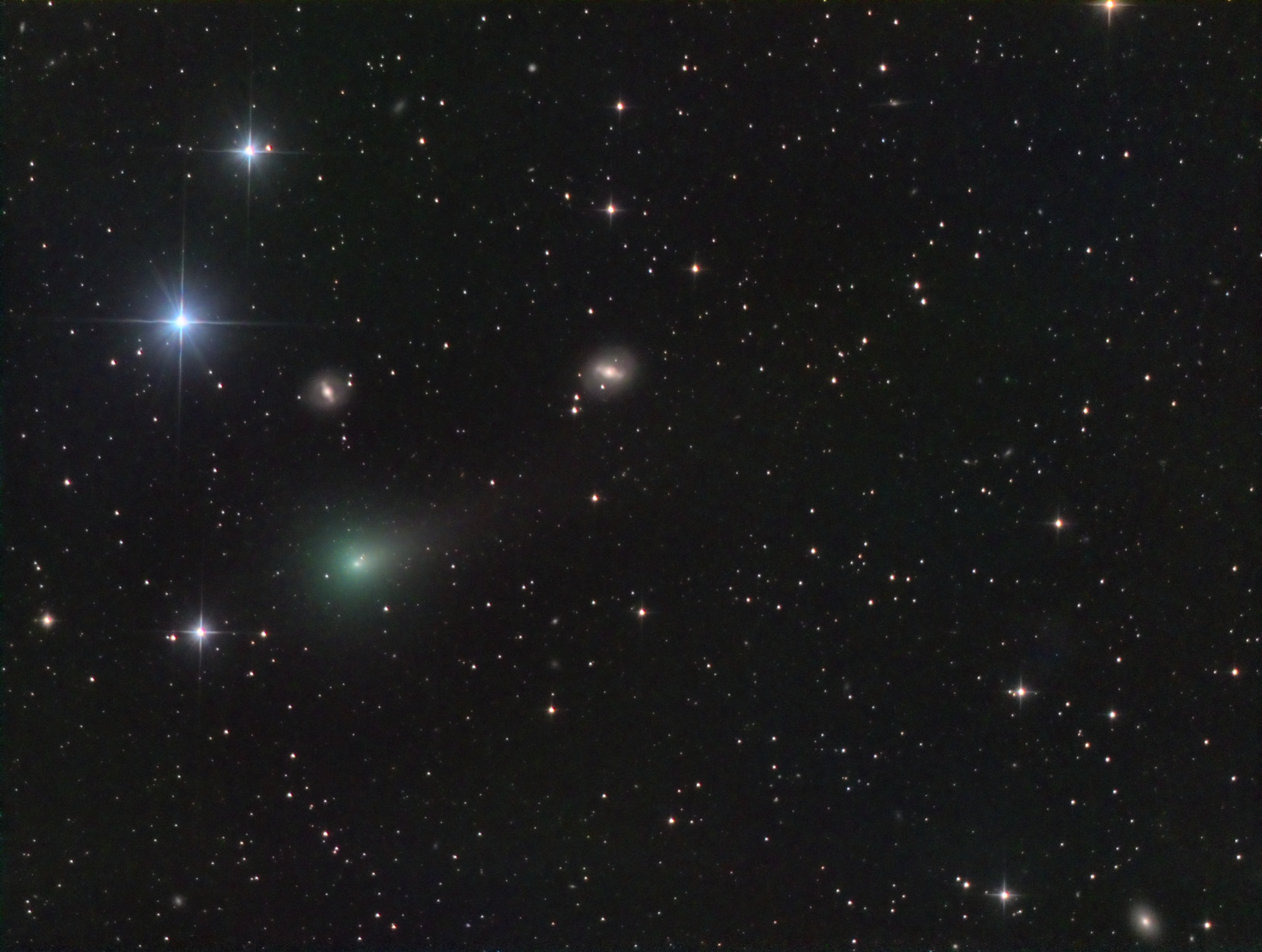 Comet 62P/Tsuchinshan on February 14, 2024, while it was located over the Virgo Cluster, a collection of over a thousand galaxies spanning about 8 degrees in the constellation Virgo. In the image field numerous galaxies can be seen, highlighting NGC 4608 just above the comet and NGC 4596 in the direction of its tail; both are lenticular galaxies with a well-defined central bar and are located at a distance of 55 million light-years. The bright blue star is Rho Virginis with a magnitude of 5, while the comet shines at magnitude 9.5 with a green gaseous coma and a tail extending half a degree in length.