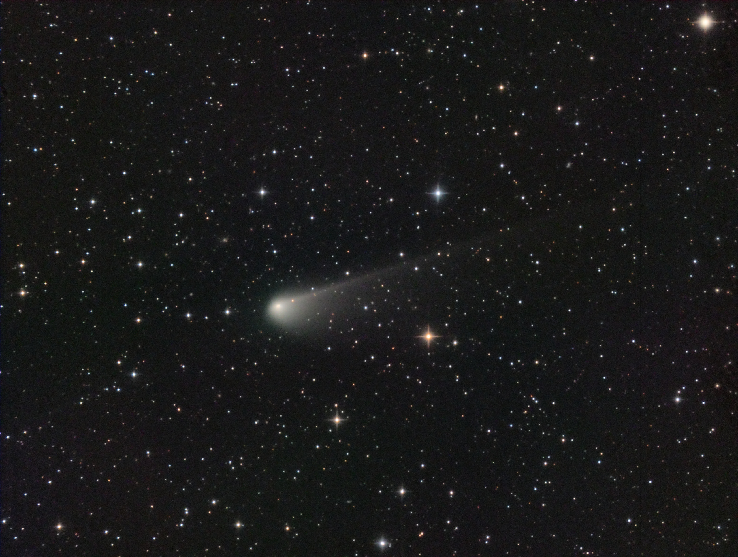 Comet 67P Churyumov-Gerasimenko imaged on January 8, 2022, with a brightness in magnitude 9 continued showing a fantastic sight through photography, registering two tails: a short one to antisunward direction and another narrow and long (more than a degree in this image and getting out of field) to antiorbital direction.