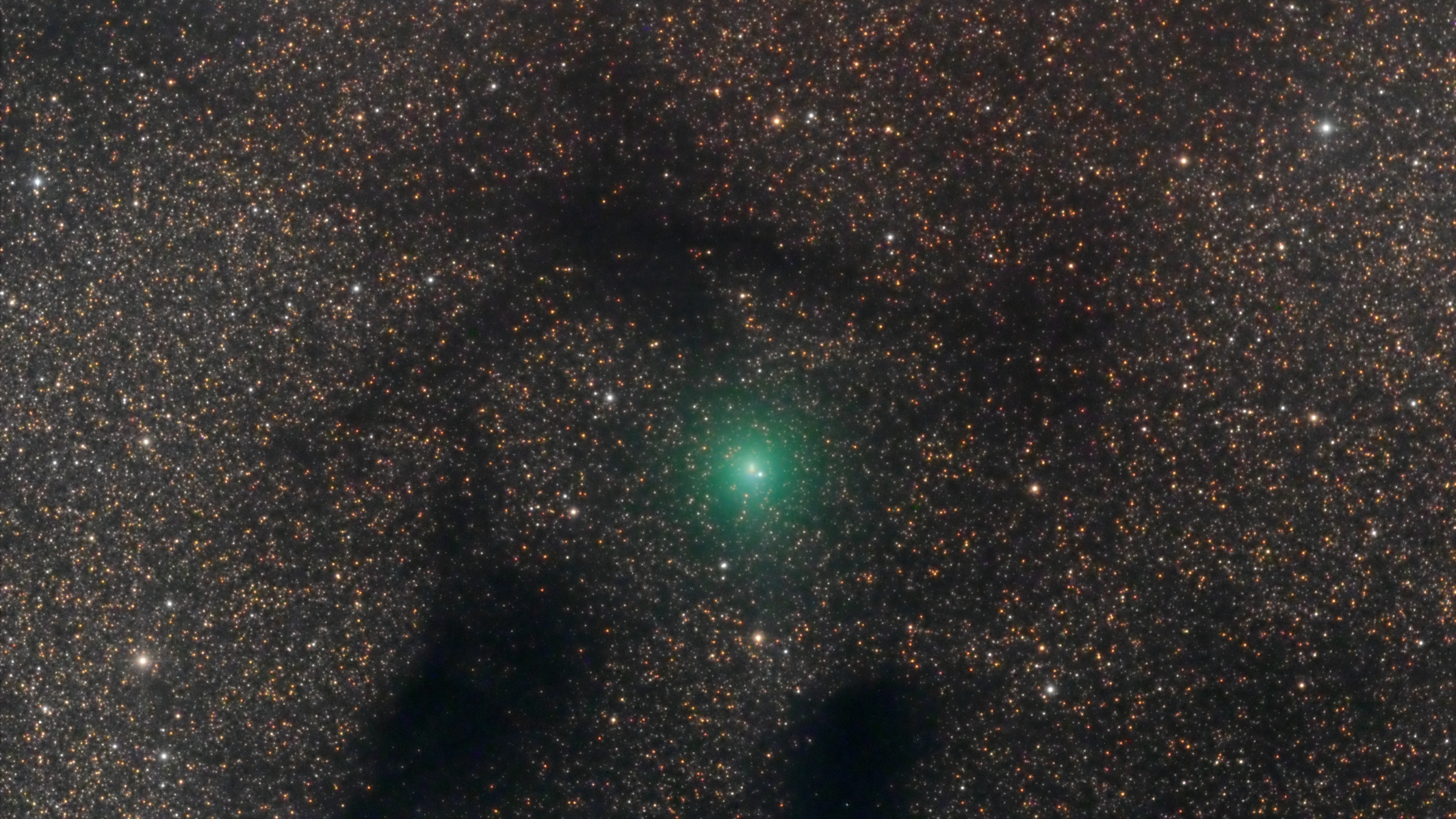 Comet 88P/Howell imaged on October 9, 2020 while passing over the complex of dark nebulae called the Pipe Nebula, in particular at down left and right are the coal-dark dust clouds Barnard 65 and Barnard 66 superimposed on thousands of stars in the Milky Way. The comet has an intense green C2 coma with 6 minute in angular size and no tail visible.