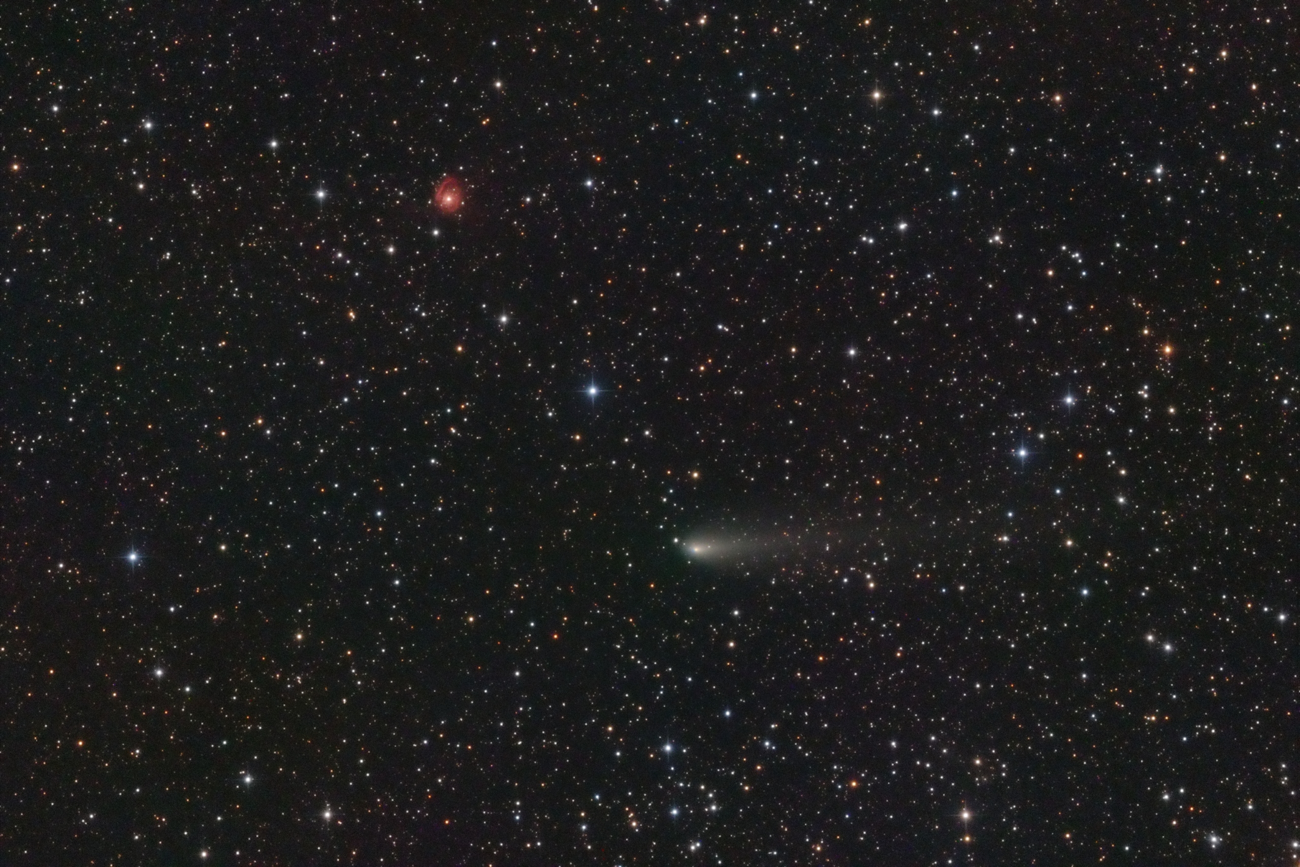 Comet 4P/Faye imaged on October 9, 2021, as it passed near the planetary nebula Sh 2-266, a ring generated by the strong stellar winds produced by the supergiant star MWC 137 within it. The comet with a brightness of magnitude 10.7 has an asymmetric coma and a tail about 15' in angular length.