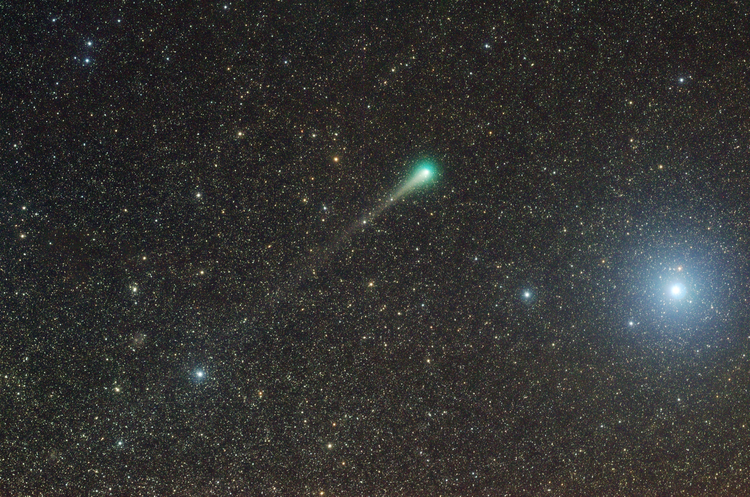 Comet C/2013 US10 (Catalina) imaged on September 17th, 2015, with magnitude 6.5 is now observable using binoculars from the Southern Hemisphere. In this wide field photography the comet is located near the bright star Alpha Lupi into constellation of the Wolf. The coma shows a strong greenish emission of C2, meanwhile its dust tail is projected toward southeast with a longitude of more than 1.5 degrees that ends confusing inside the Milky Way which fills the bottom of image.