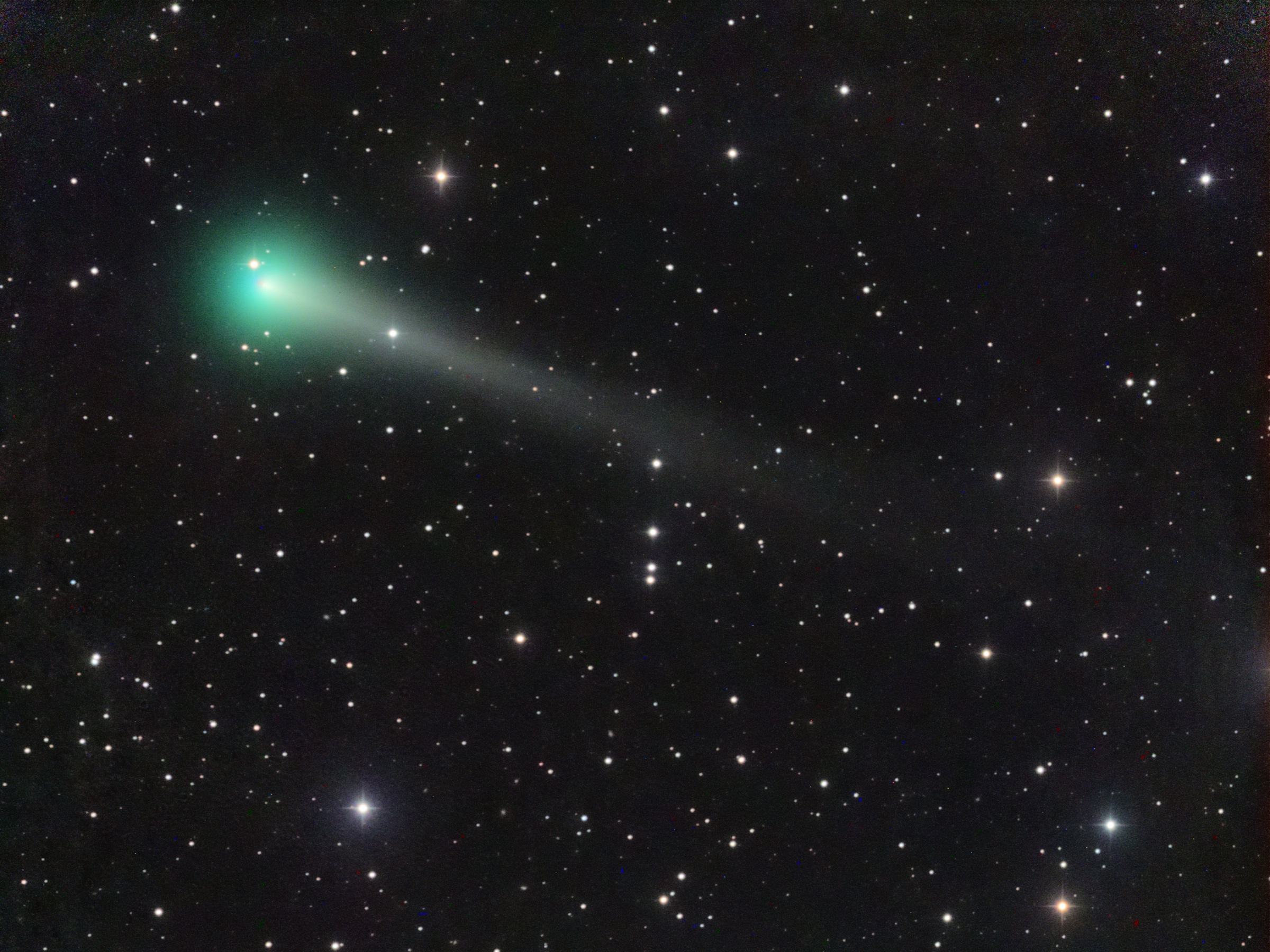 Comet C/2015 ER61 (PANSTARRS) imaged on 29th, April 2017, nearly a month after an outburst. After its approach to Earth its brightness had dropped until 7.5 magnitudes in this image taken ten days before perihelion. In spite of this the comet keeps showing a turquoise cocoon from wich departs a intense ionic tail that leaves the field toward southwest.