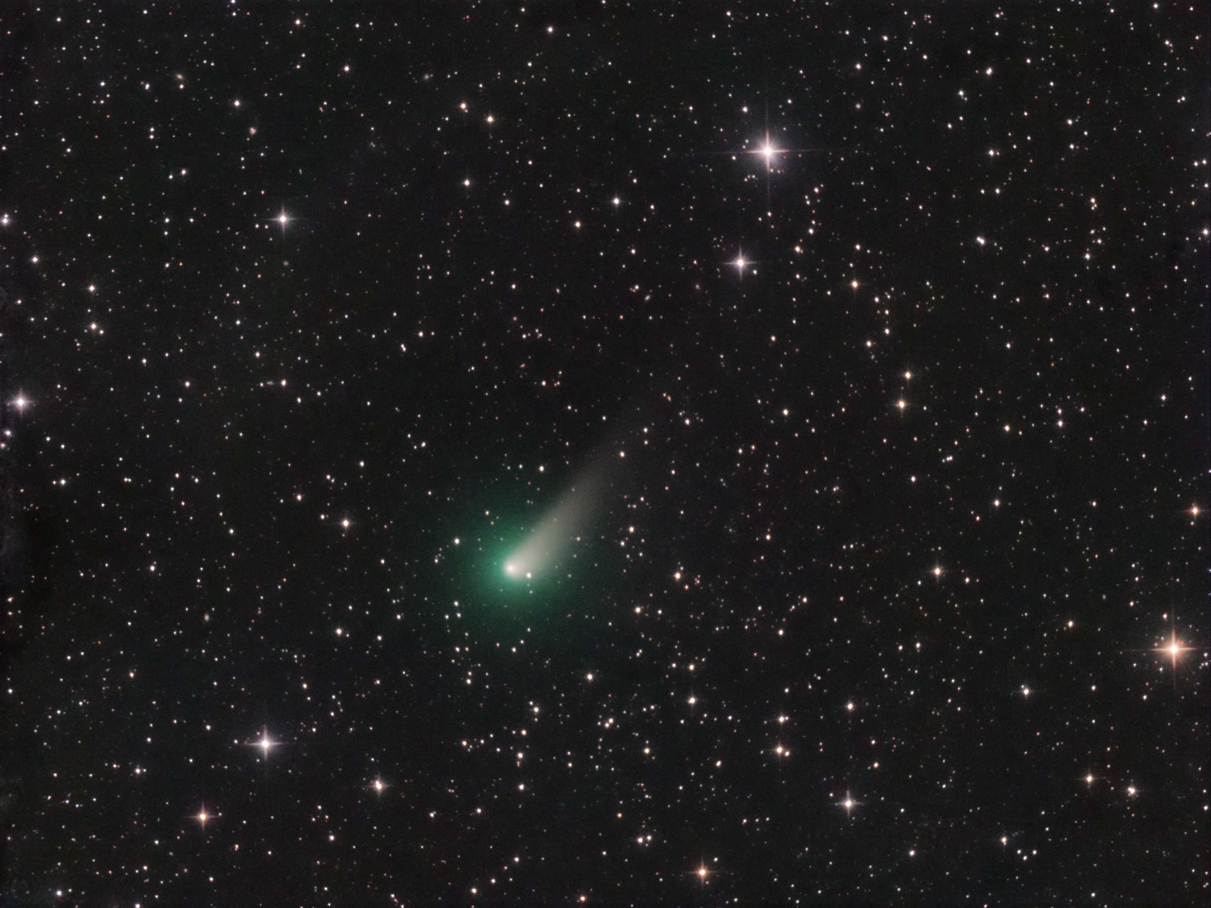 Comet C/2015 V2 (Johnson) imaged in March 26th, 2017, at that time with a brightness of magnitude 9,5 shows in this image a greenish coma with a diameter of 10 arcminutes and a dust tail near 20 arcminutes toward northwest.