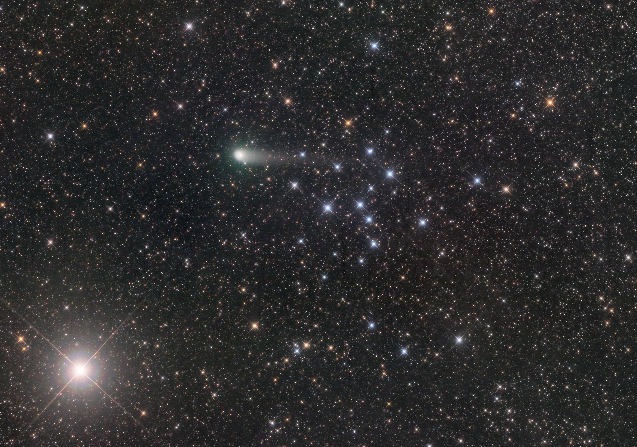 Comet C/2017 K2 (PANSTARRS) on June 20th, 2022, just as it passed over the open cluster IC 4665 and near the bright 3rd magnitude star Cebalrai (Beta Ophiuchi) on top of a star-studded background at the edge of the Milky Way. The comet with a brightness in magnitude 9 is at 2 AU from Earth and approaching to perihelion showing a dust tail more than half a degree in length crossing over the bluish young stars of the cluster.