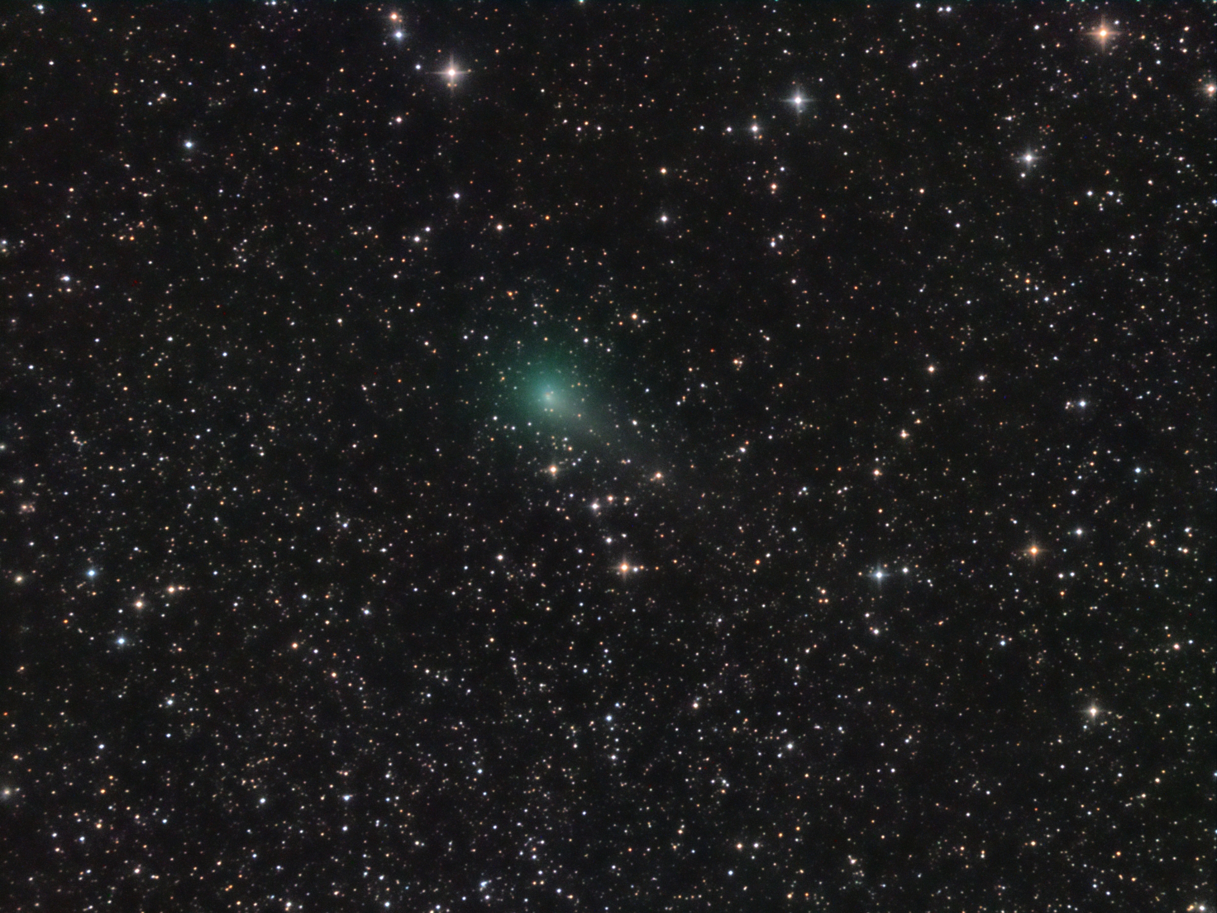 Comet C/2017 O1 (ASASSN) photographed on October 21th, 2017, which at the time begun to recede away from the Sun as well as the Earth. In spite of it the comet had a brightness drop of half magnitude until 8.5, still showed photographically a coma with 10' diameter, although with a very diffuse external layer, and also a faint 20' long tail toward southwest.