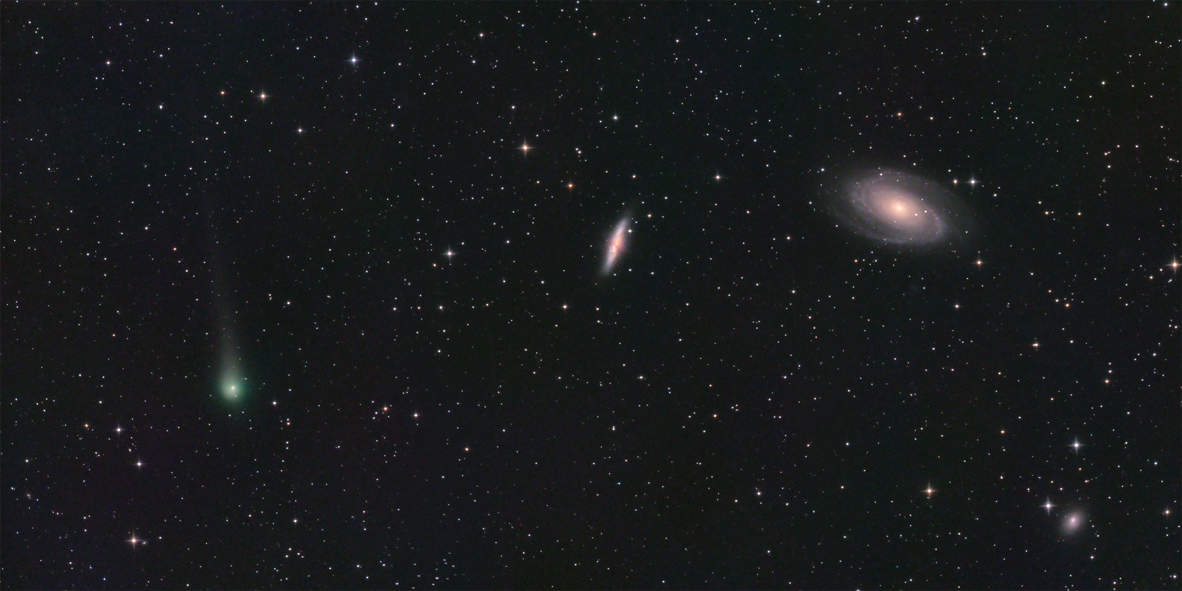 Comet C/2017 T2 (PANSTARRS) on 2020 May 22nd, just as it passed near galaxies M 81 (right) and M 82 (center) in the constellation Ursa Major. On the left, the comet with a brightness around magnitude 9 shows a coma about 5' in angular size and a dust tail of one degree in length. The image is a mosaic composed horizontally of three tiles to cover the field of almost three degrees required by the scene.