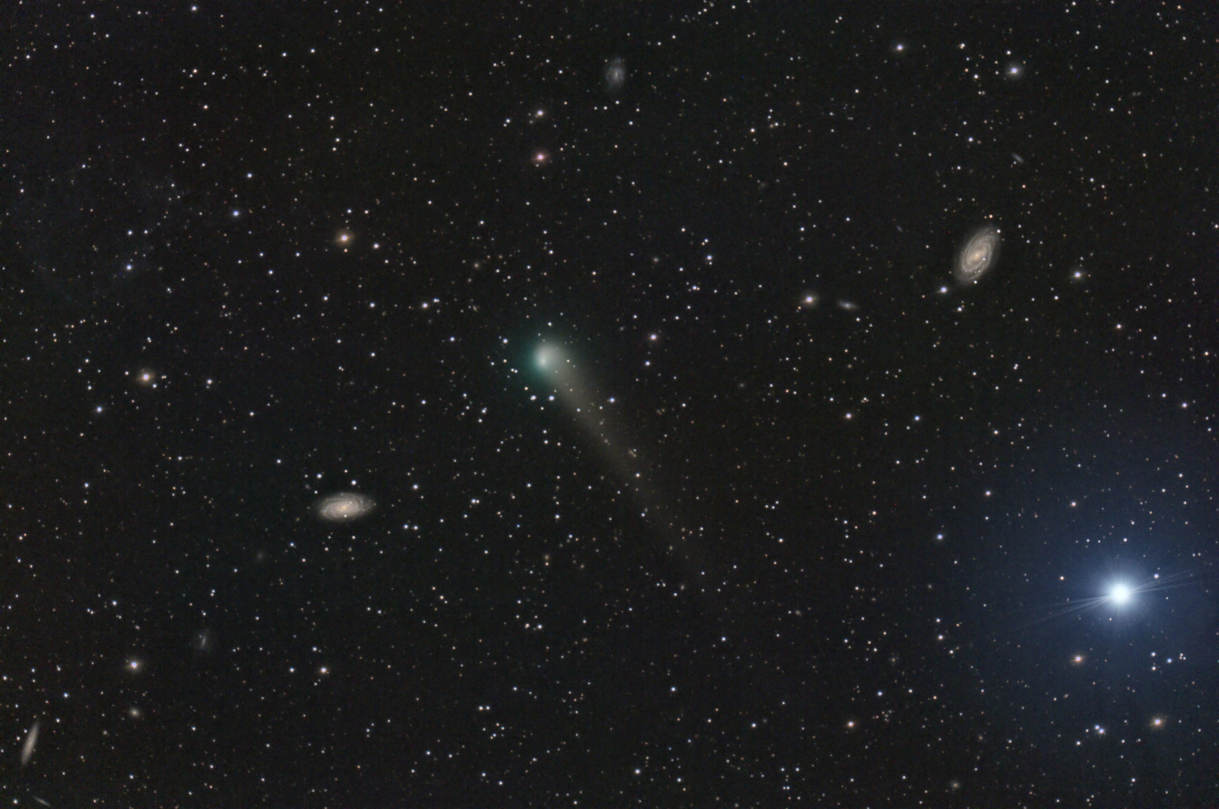 Comet C/2017 T2 PANSTARRS on June 17th, 2020 just as it passed between galaxies M 109 (right) and NGC 3953 (left), dozens of other small galaxies dot the field two degrees wide but stand out across the scene with magnitude 2.4 the star Phecda or Gamma Ursae Majoris (one of the four stars of the Big Dipper Ursa Major). The comet with a magnitude at 9 has an asymmetric coma 8' in angular size and a dust tail 1° long.