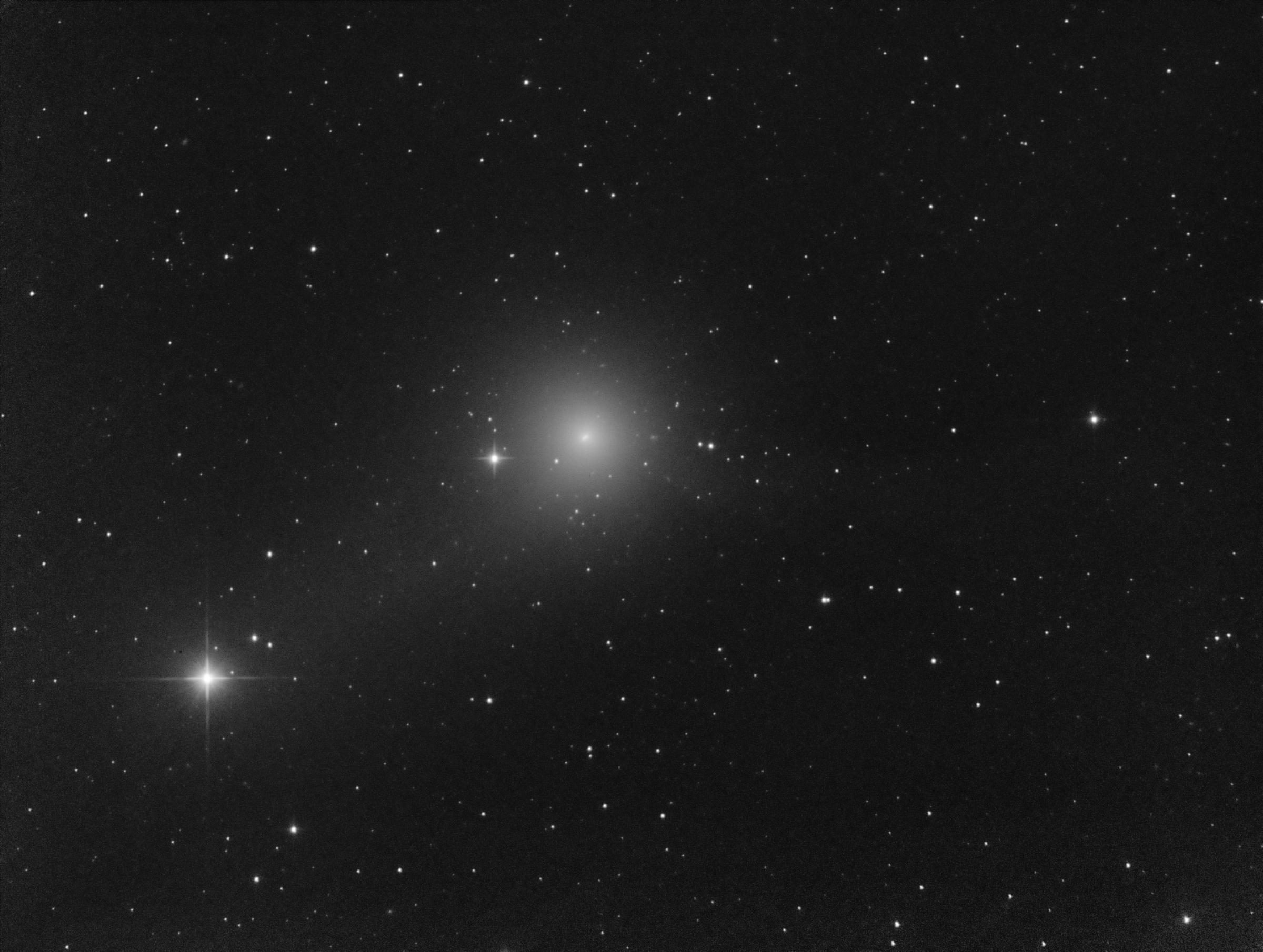 Comet C/2018 Y1 Iwamoto on February 10th, 2019, three days after its perihelion and three days before its closest approach to Earth. Its ionic tail is faintly visible toward West (to right) in this image, at the same time it is possible to see a dust tail toward Southeast (to down-left), only during these days in which our planet crosses the orbital plane of the comet. Iwamoto also reached in those days its maximum brightness with a magnitude near 6.5 and a coma with angular size of 20'. The brightest star into field is Chi Leonis with magnitude 4.6.