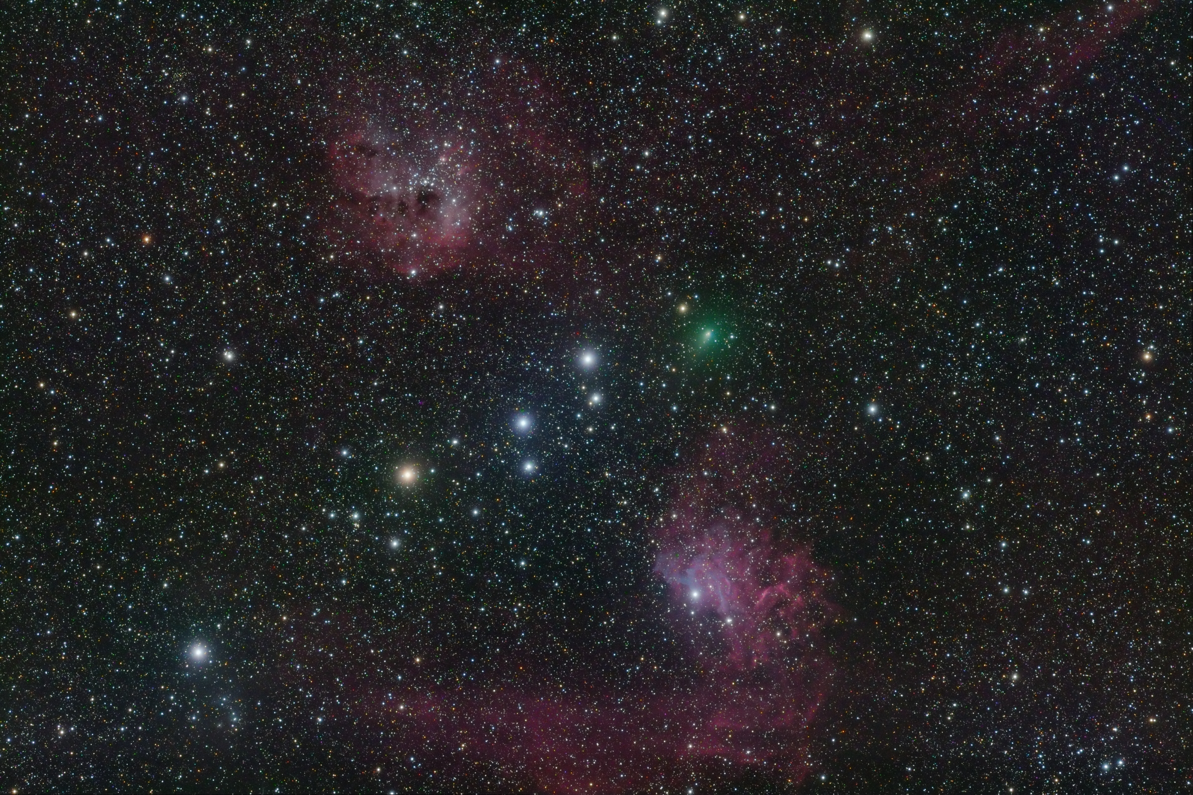 Comet C/2020 M3 (ATLAS) imaged on December 10th, 2020, just as it passed between the Tadpole Nebula IC 410 (top) and the Flaming Star Nebula IC 405 (bottom), both regions of ionized hydrogen are located in the Milky Way in the constellation Auriga. The comet has a very faint 15 arc minute green coma and a short southwesterly dust tail.
