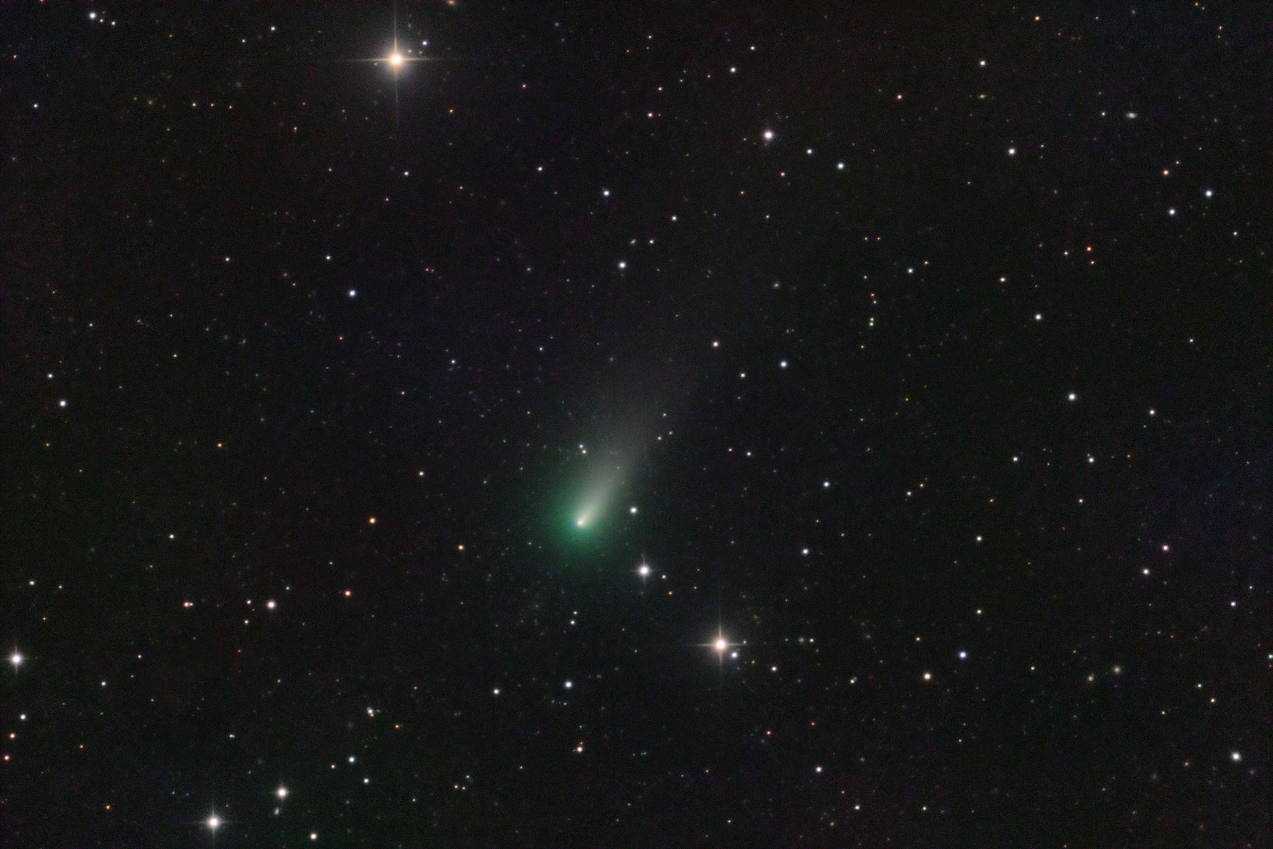 Comet C/2021 A1 (Leonard) imaged on November 4th, 2021, since my previous image its look has changed dramatically: in just two weeks its brightness has increased from magnitude 11.5 to 10, its coma has increased in angular size from 4' to 9' having developed an strong outer halo of intense green color, and its tail has grown from 5' to 16' in length. Everything continues signaling that the comet is very active and it keeps the expectation of being observable at naked eye in December.