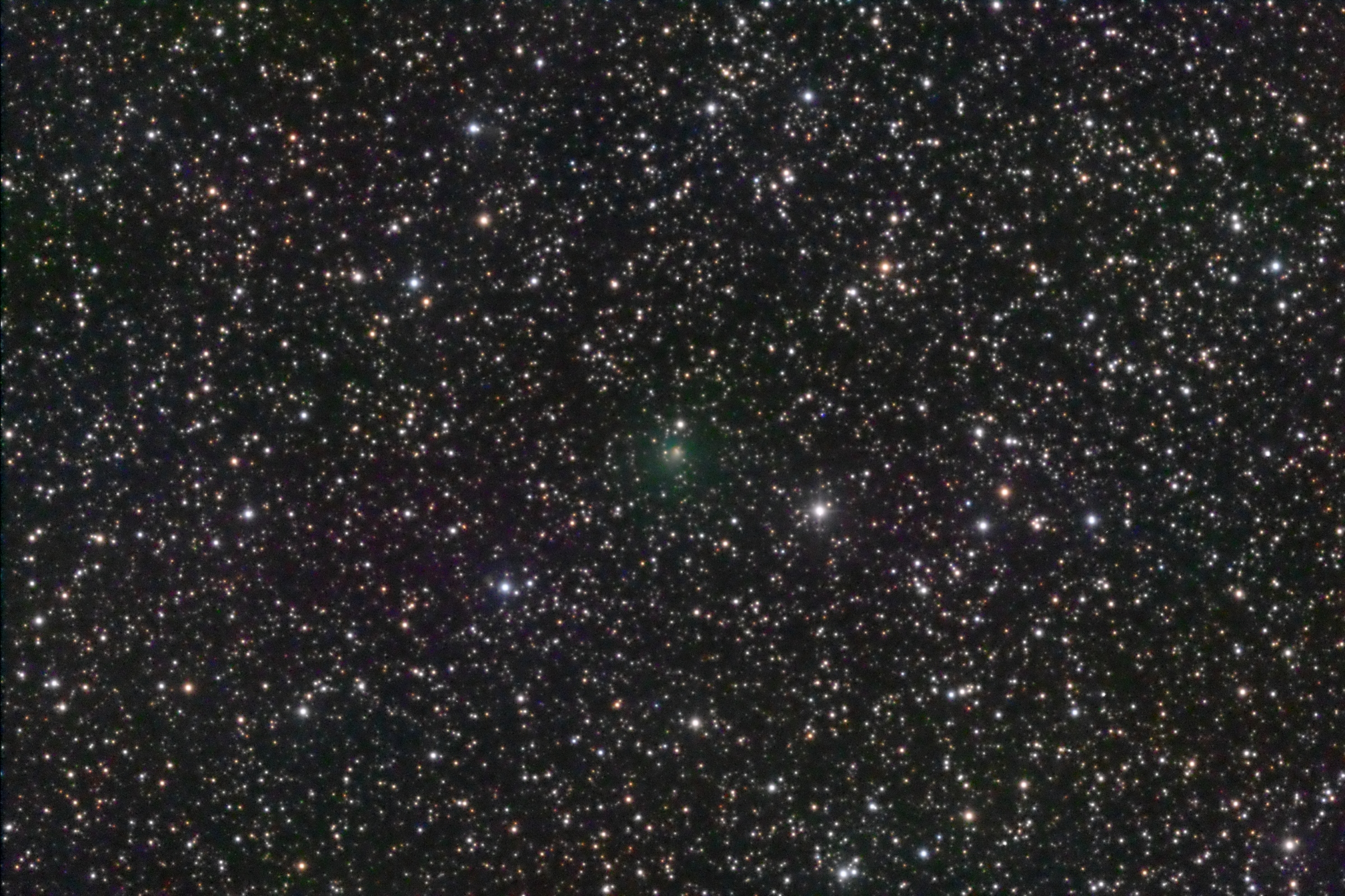 Comet C/2021 A2 (NEOWISE) imaged on January 16th, 2021, two weeks after its discovery. Rapidly brightening, the comet has magnitude 11.5 in this image, registering a very faint green coma with about 3 arcminutes elongated to northeast, without tail. This comet could reach magnitude 10.5 in February.