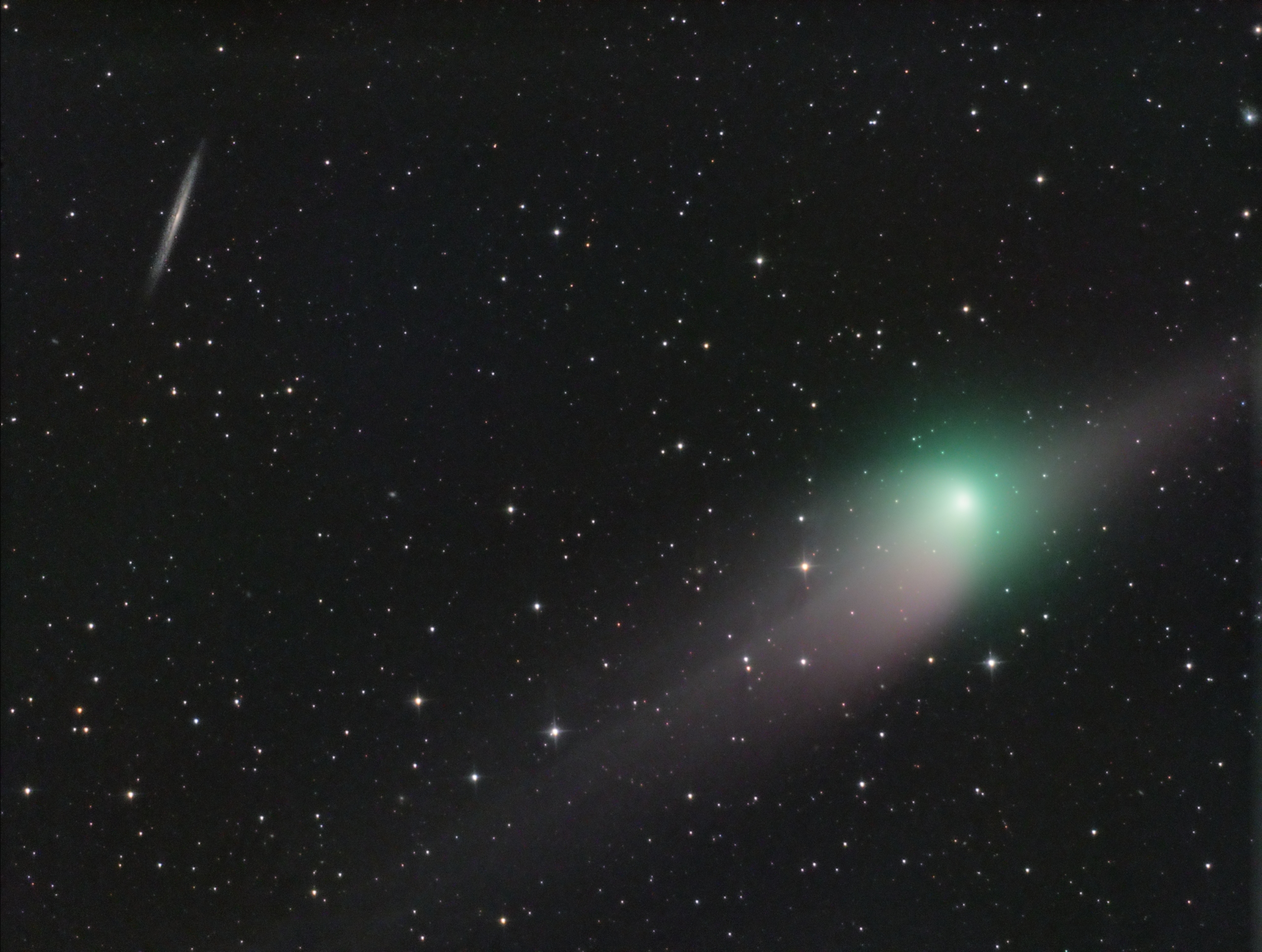 Comet C/2022 E3 (ZTF) imaged on January 23rd, 2023 with a brightness at magnitude 5.6, just when it was in conjunction with the spiral galaxy NGC 5906 that we see edge-on, we also see the comet's antitail edge-on because this day the Earth was crossing the orbital plane of the comet, reflecting sunlight for its heavy grains of dust with a reddish hue. The ionic tail and the "normal" dust tail are superimposed to the left.