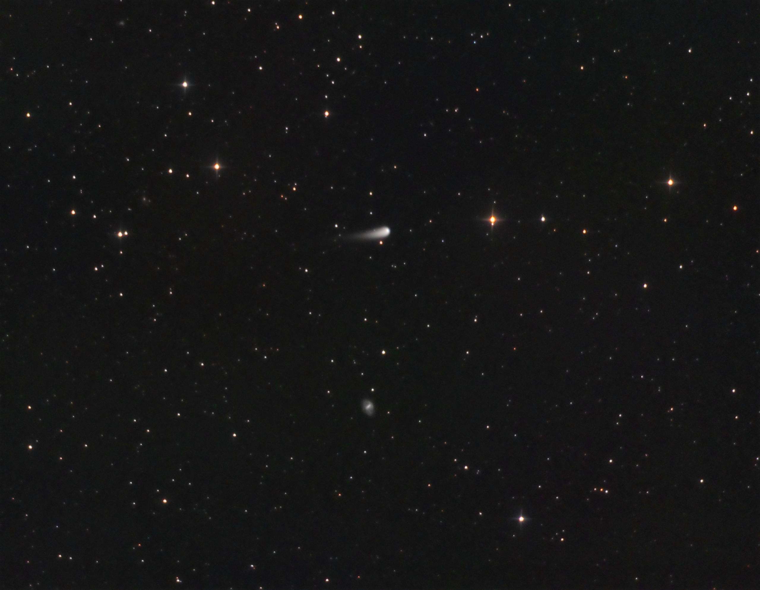 After many cloudy nights, on May 8th I was finally able to image the comet C/2023 A3 (Tsuchinshan-ATLAS) again in a long series of shots to create a color image. Despite its same appearance, its dust tail continues to appear longer due to our changing perspective from Earth, reaching a length of almost 9 arc minutes in this image. As for its brightness, it remains at magnitude 10.5, waiting for it to resume activity and not compromise its peak brightness too much for October. By the way, below the comet you can see the barred spiral galaxy NGC 4904.