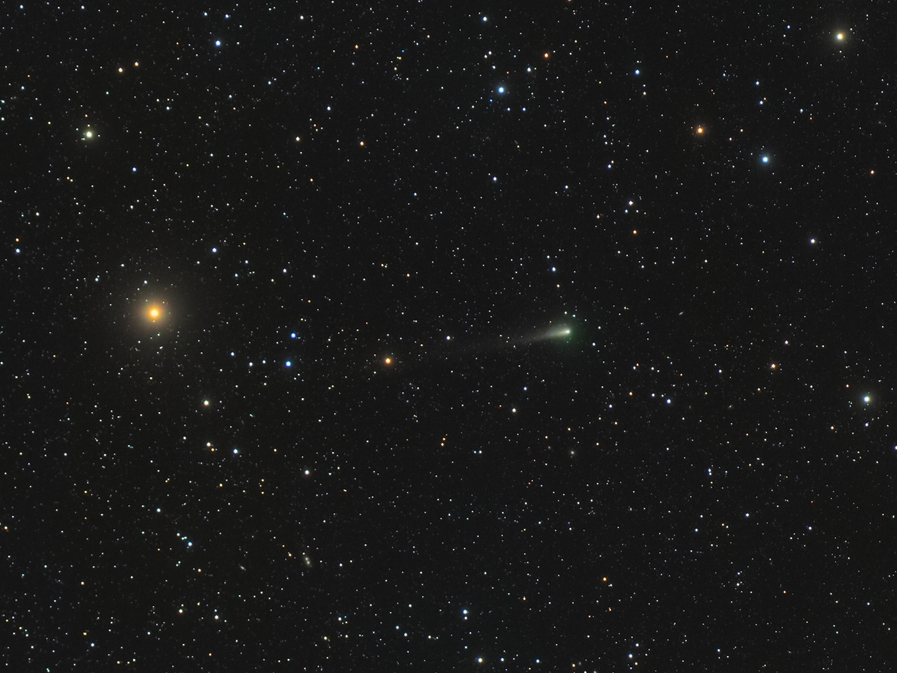 After its first approach to Earth, I imaged comet C/2025 K1 (ATLAS) on August 21, 2025, when it was near the star 9 Herculis. In this image it shines at about magnitude 12.5, showing a greenish coma just over 2 arcminutes wide with moderate central condensation. The tail extends roughly 20 arcminutes. On its way to perihelion, which it will reach on October 8 at only 0.33 AU from the Sun – inside Mercury’s orbit –, the comet faces a high risk of disintegration. If it survives, it could become observable again on its return toward Earth, in the morning sky of the Northern Hemisphere, reaching a brightness near magnitude 8 and perhaps visible with binoculars.