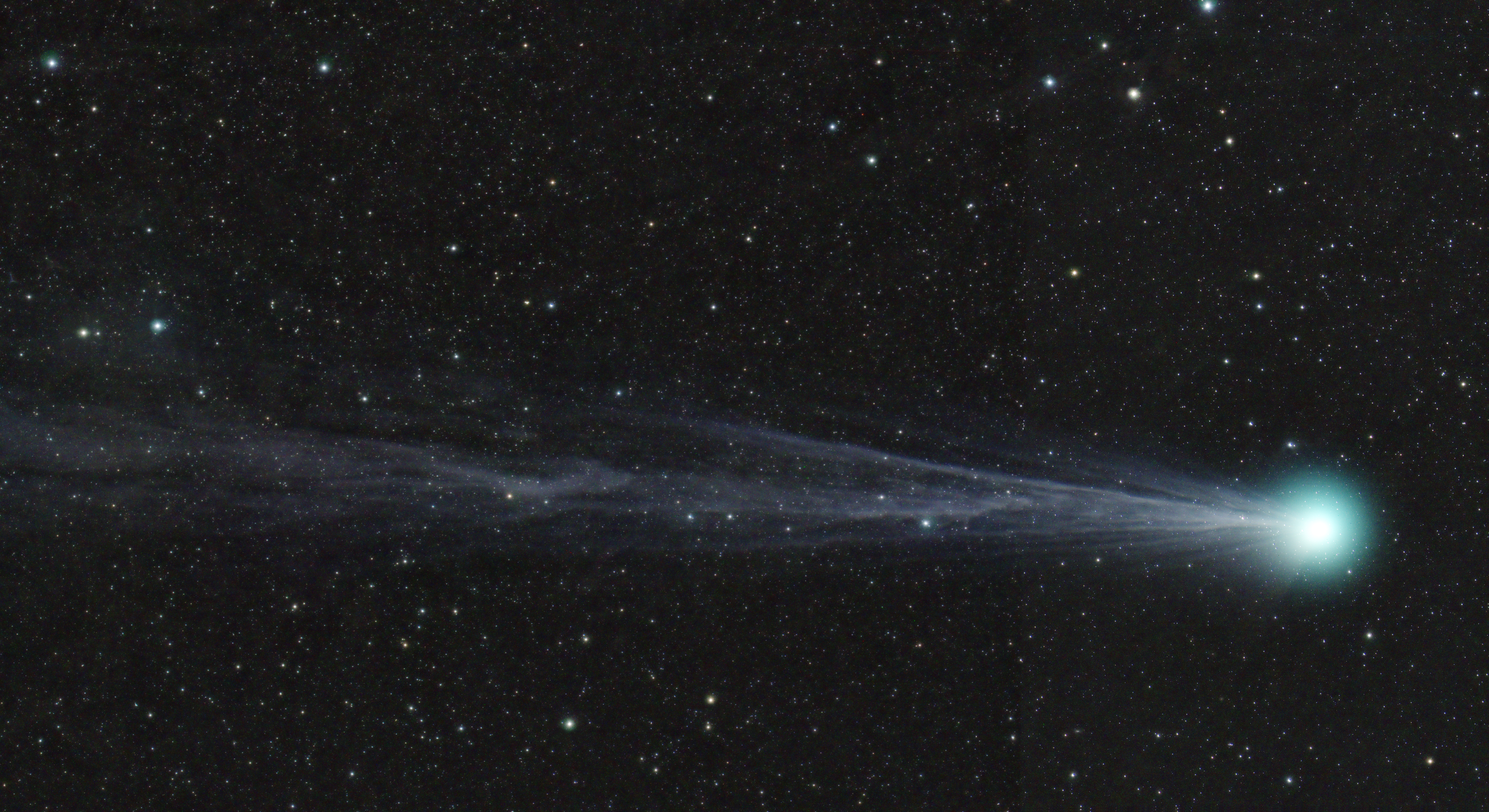Comet C/2014 Q2 (Lovejoy) on January 16, 2015 at its best. In this image, composed by a mosaic of three frames and covering a field of 7 x 3.5 degrees, the comet shows a powerful coma of 40' wide shinning at 4th magnitude. A long gassy tail is thrown toward East in which can be see several jets opening in angle. Manifold details are perceived in these streamers, ripples, knots and a disconnection at 2 degrees from nucleus.