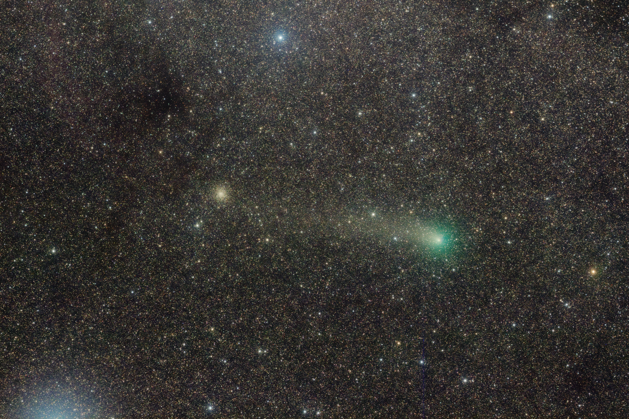 Comet C/2013 X1 (PANSTARRS) imaged on June 30th, 2016, a week after its closest approach to Earth and moving away toward outer of Solar System, the comet suddenly has lost its ion tail, only the dust trail remains behind its orbit (tail type III). In this widefield image the comet appears above a dense zone of the Milky Way between the constellations Scorpius and Ara with its tail projected towards the globular cluster NGC 6352. The brightest star at upper is Iota Arae and down-left can be perceived the glow of the near star Alpha Arae of magnitude 2.8.