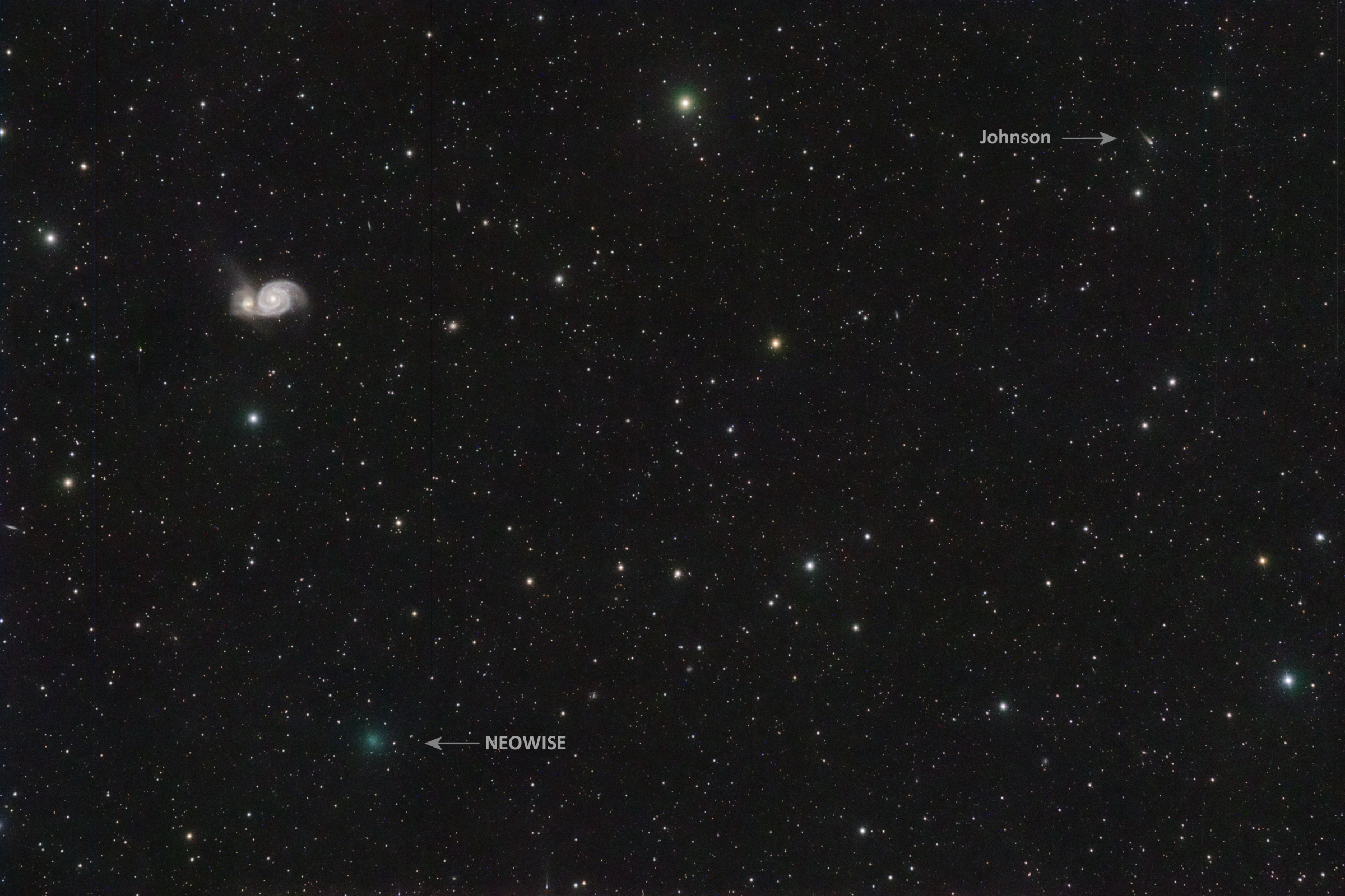 Two new comets in approach to Sun are found in the same field near Whirlpool Galaxy (M 51) in this image taken on December 1st, 2016. At the left bottom, the recently discovered C/2016 U1 (NEOWISE) shows a fuzzy and green coma due to its composition of ionized carbonic gas, while at upper right is the comet C/2015 V2 (Johnson) with a very different morphology, more dusty that gassy, shows a small and whitish coma with a short tail of dust. Both comets could be observed using binoculars in the future: NEOWISE at the end of this month of December before immerse into dawn, of which perhaps will not come out because is possible the comet to disintegrate at approach to Sun; comet Johnson will reach its maximum brightness on next spring 2017.