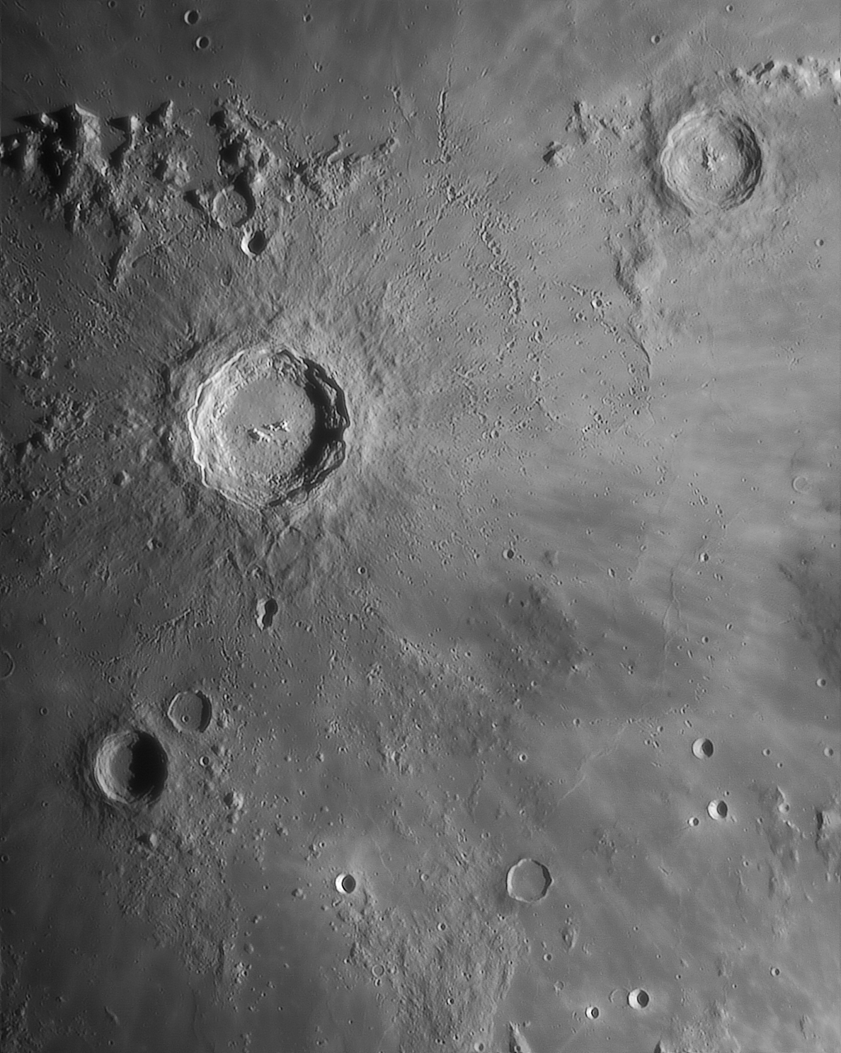 Eingebettet zwischen den Ringgebirgen Eratosthenes und Copernicus mit ihren markannten terrassenförmig nach innen abfallenden Kraterwänden liegt der kaum noch sichtbare Krater Stadius. Südlich an Copernicus schließen sich im Mare Insularum der Doppelkrater Fauth und der noch halb verschattete Krater Reinhold an. Man beachte, wie der Schattenwurf in letzterem Kater die unterschiedliche Höhe des östlichen Kraterrands nachzeichnet.