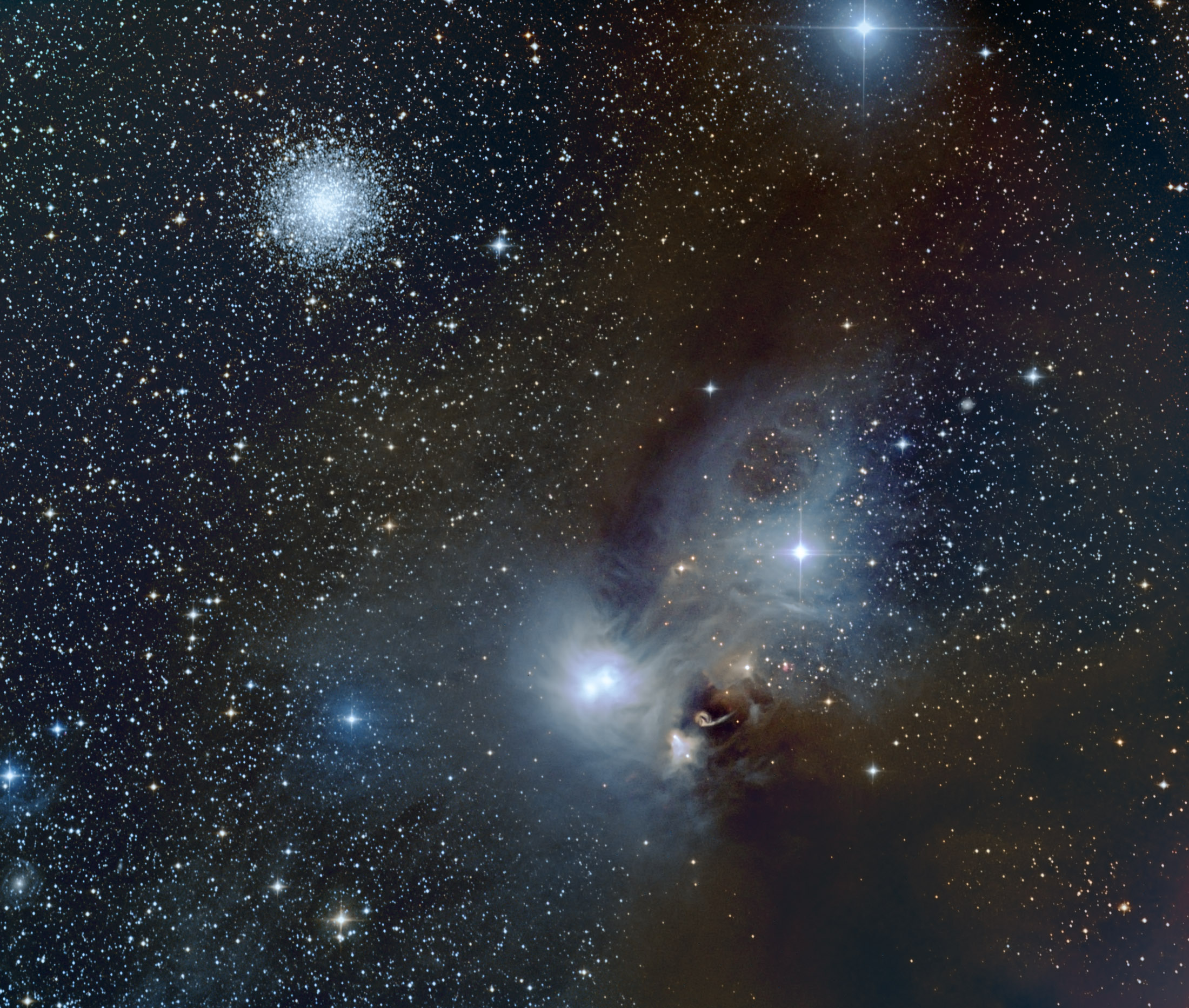 Etwas entfernt von der galaktischen Ebene im Sternbild Corona Australis (Südliche Krone), in einer Entfernung von etwa 500 Lichtjahren, liegt eines der nahesten und auch interessantesten Sternentstehungsgebiete. Die riesige Corona Australis Molekülwolke (die sternarmen Bereiche in diesem Bild) verschluckt das Licht der Hintergrundsterne. Nur die Strahlung einiger sehr heller junger Sterne wird an den Staubwolken reflektiert und erzeugt die herrlichen Reflektiosnebel in diesem Bild.