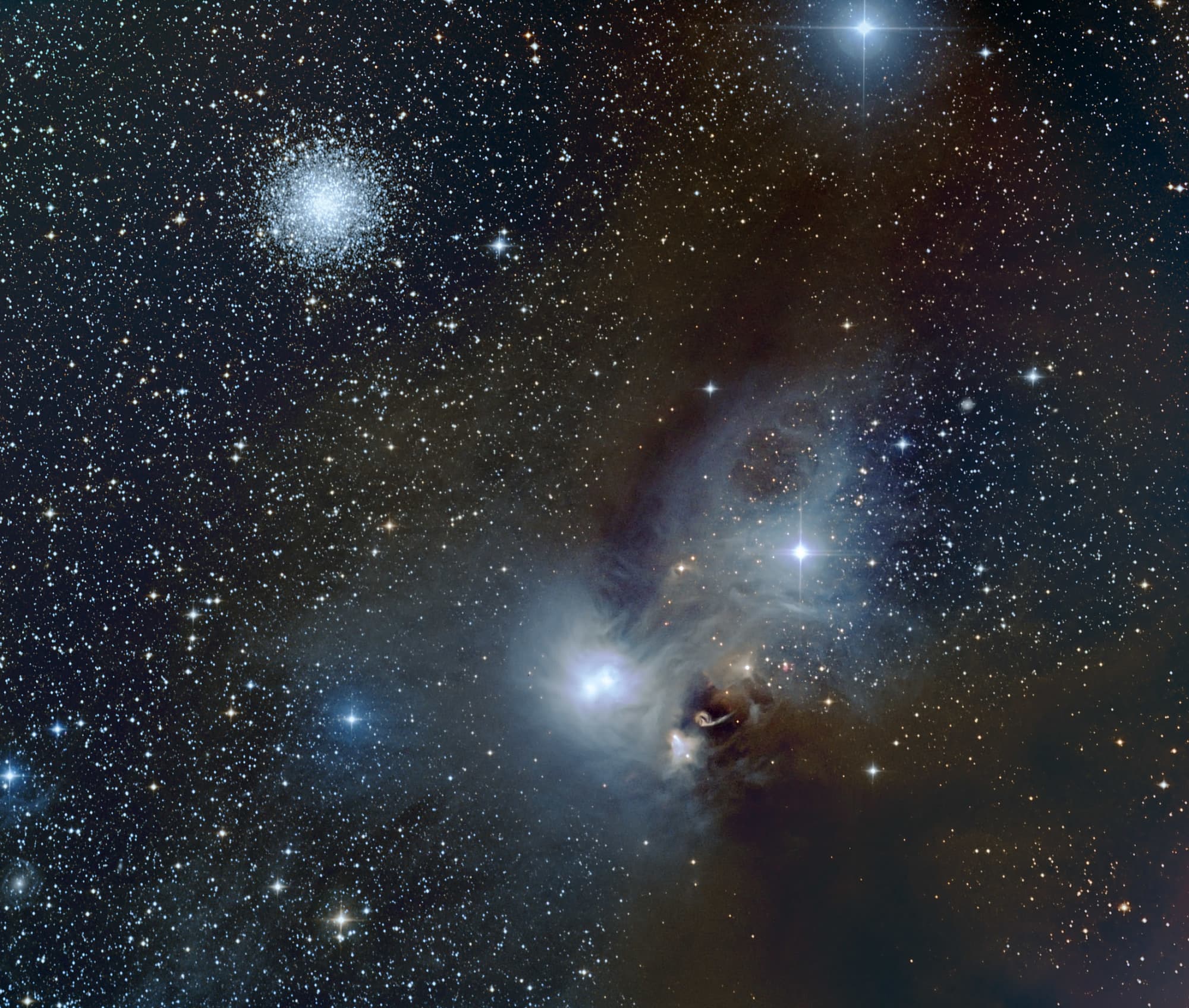 Links oben im Bild findet man einen sehr schönen Kugelsternhaufen (NGC 6723), der sich scheinbar in der Nähe der Nebel befindet. In Wirklichkeit steht er jedoch sehr viel weiter entfernt in einigen 30 000 Lichtjahren Entfernung.