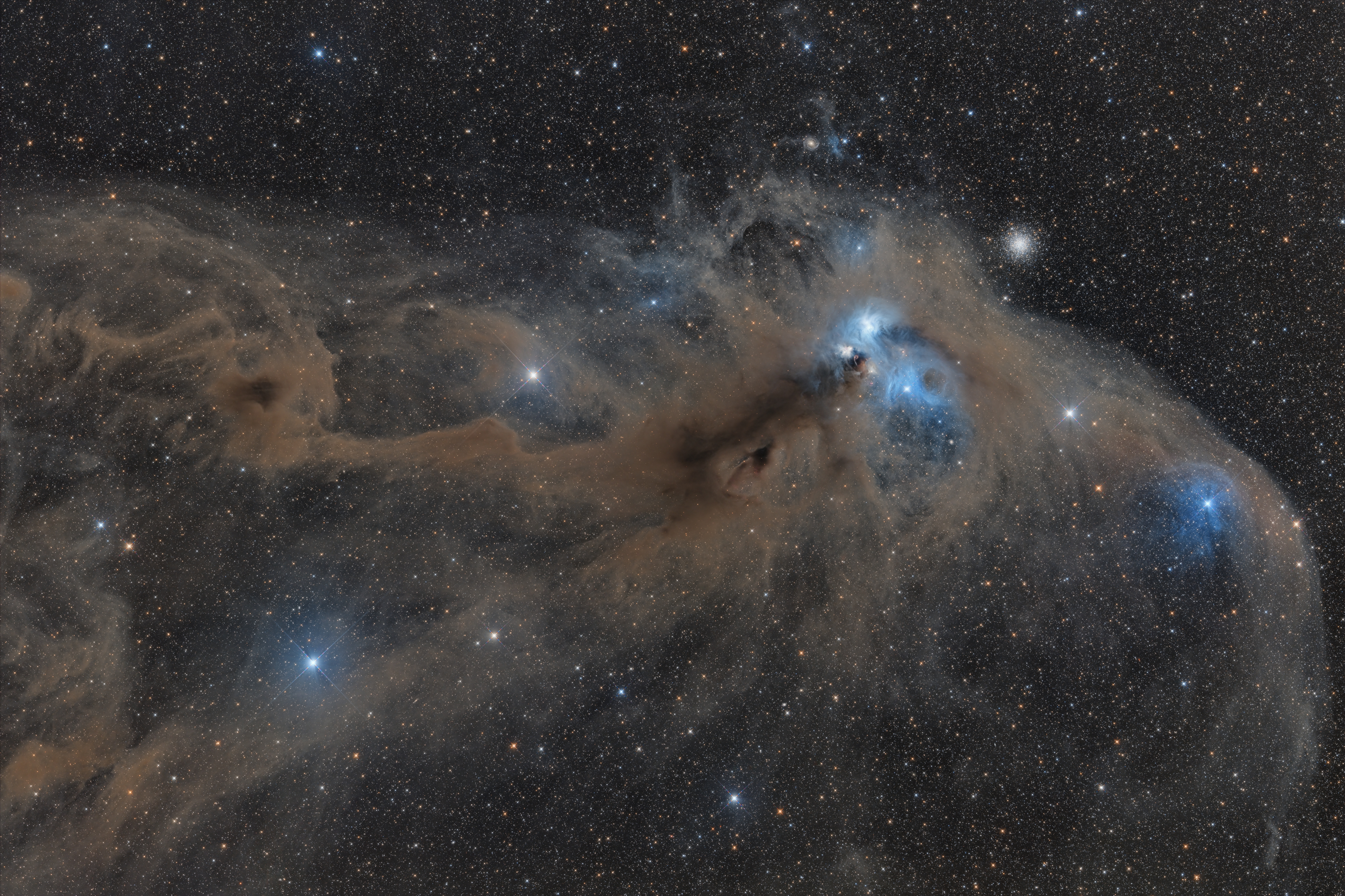 Das mit ShaRA#10 aufgenommene Motiv ist eine wunderschöne Region des Südhimmels im Sternbild Corona Australis. Innerhalb dieser Konstellation gibt es eine sehr interessante Molekülwolke, da sie eine der Sternentstehungsregionen ist, die unserem Sonnensystem am nächsten liegt (etwa 400/500 Lichtjahre entfernt, ein Drittel der Entfernung, die uns vom Orionnebelkomplex trennt). In dem von uns aufgenommenen Feld gibt es eine beeindruckende Reihe von Objekten: dunkle Nebel, Herbig-Haro-Objekte, junge Sternhaufen, Reflexionsnebel, einen wunderschönen Kugelsternhaufen und einige Hintergrundgalaxien. NGC 6729 ist ein blauer Reflexionsnebel, der etwa 424 Lichtjahre von der Erde entfernt liegt. Dieser Nebel ist Teil eines größeren Komplexes, zu dem auch der Emissionsnebel NGC 6726-27 und der offene Sternhaufen IC 4812 gehören. Sein Hauptmerkmal ist die Anwesenheit eines jungen veränderlichen Sterns, R Coronae Australis, der den Nebel mit seinem Licht beleuchtet. Die Interaktion zwischen dem Sternenlicht und dem umgebenden Material erzeugt auffällige Licht- und Schattenkontraste und macht NGC 6729 zu einem beliebten Motiv unter Astrofotografen. Der Coronet-Haufen, auch bekannt als CrA, ist ein junger Sternhaufen, der etwa 554 Lichtjahre von der Erde entfernt liegt und sich in derselben Region befindet, in der sich auch NGC 6729 befindet. Dieser Haufen ist einer der erdnächsten und dient als natürliches Labor für die Untersuchung von Sternen Bildung. Mit einem geschätzten Alter von einigen Millionen Jahren ist der Coronet-Haufen immer noch von einer Molekülwolke aus Gas und Staub umgeben, dem Urmaterial, aus dem sich Sterne bilden.