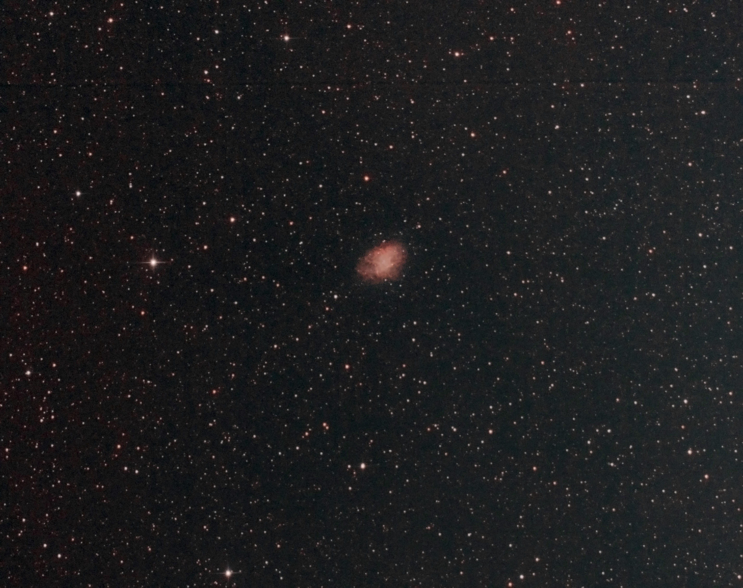 Nach berufsbedingt längerer Zwangsabstinenz konnte ich am 4.4.2015 endlich mal wieder meinen kleinen Newton-Reflektor 130/650 PDS von Skywatcher zur Astrofotografie nutzen. Ich fertigte, übermütig wie ich war, trotz Ostervollmond eine bescheidene Belichtungsreihe des bekannten Supernovaüberrestes Messier 1 an, nicht zuletzt um mal zu testen, wie er sich im kleinen Newton so macht. Das Ergebnis macht deutlich, dass es sich lohnt, in der nächsten Wintersaison unter besseren Umständen mehr Belichtungszeit zu investieren. Wenigstens sind jetzt endlich die Lichterketten verschwunden...