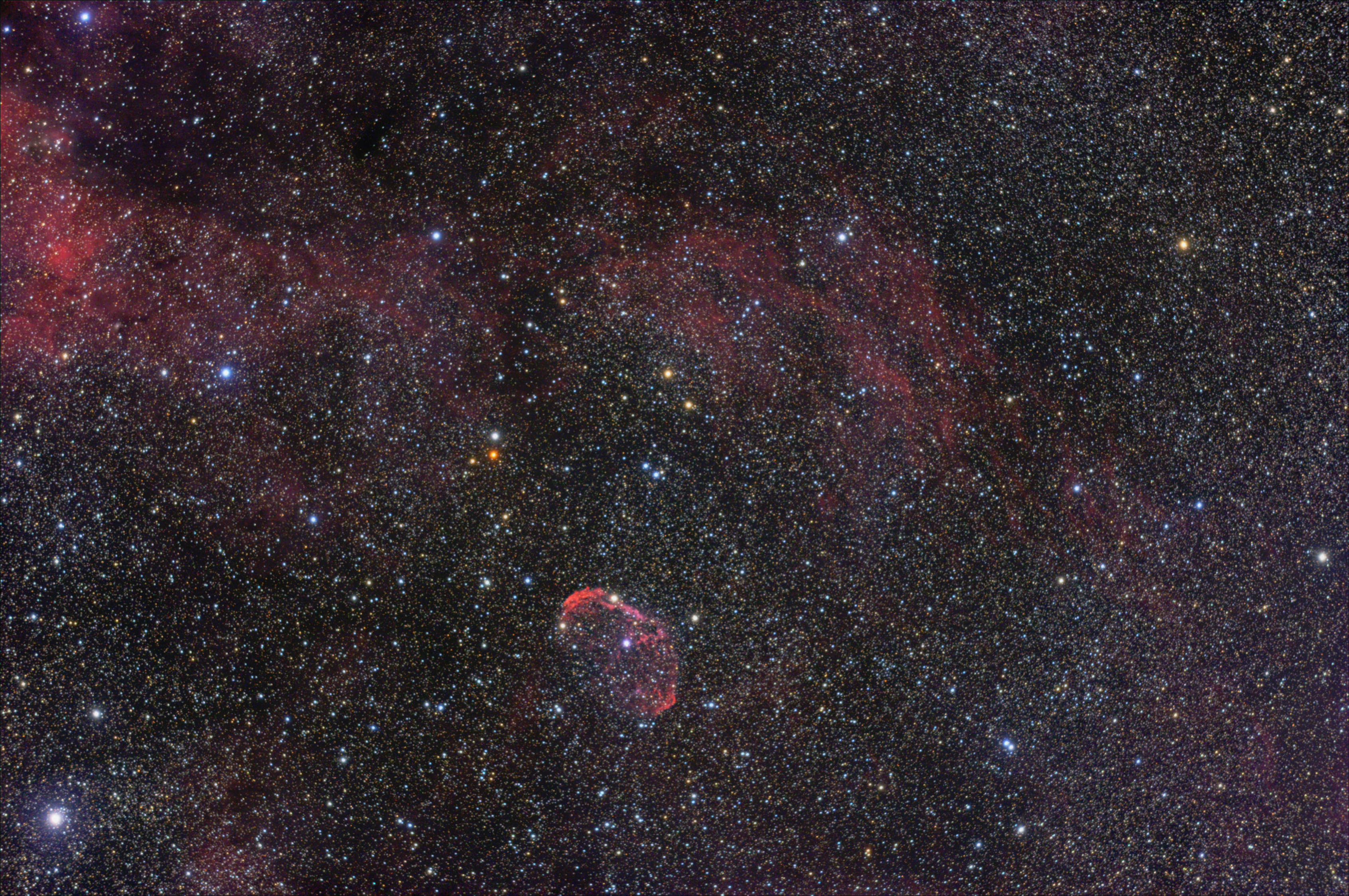 Ich hatte vor, ein Crescent-Widefield zu machen mit den großen ihn umgebenden HII-Regionen. Leider war die Durchsicht nicht optimal und wegen Zirren musste ich nach zehn Aufnahmen abbrechen. Dennoch finde ich das Bild gelungen.