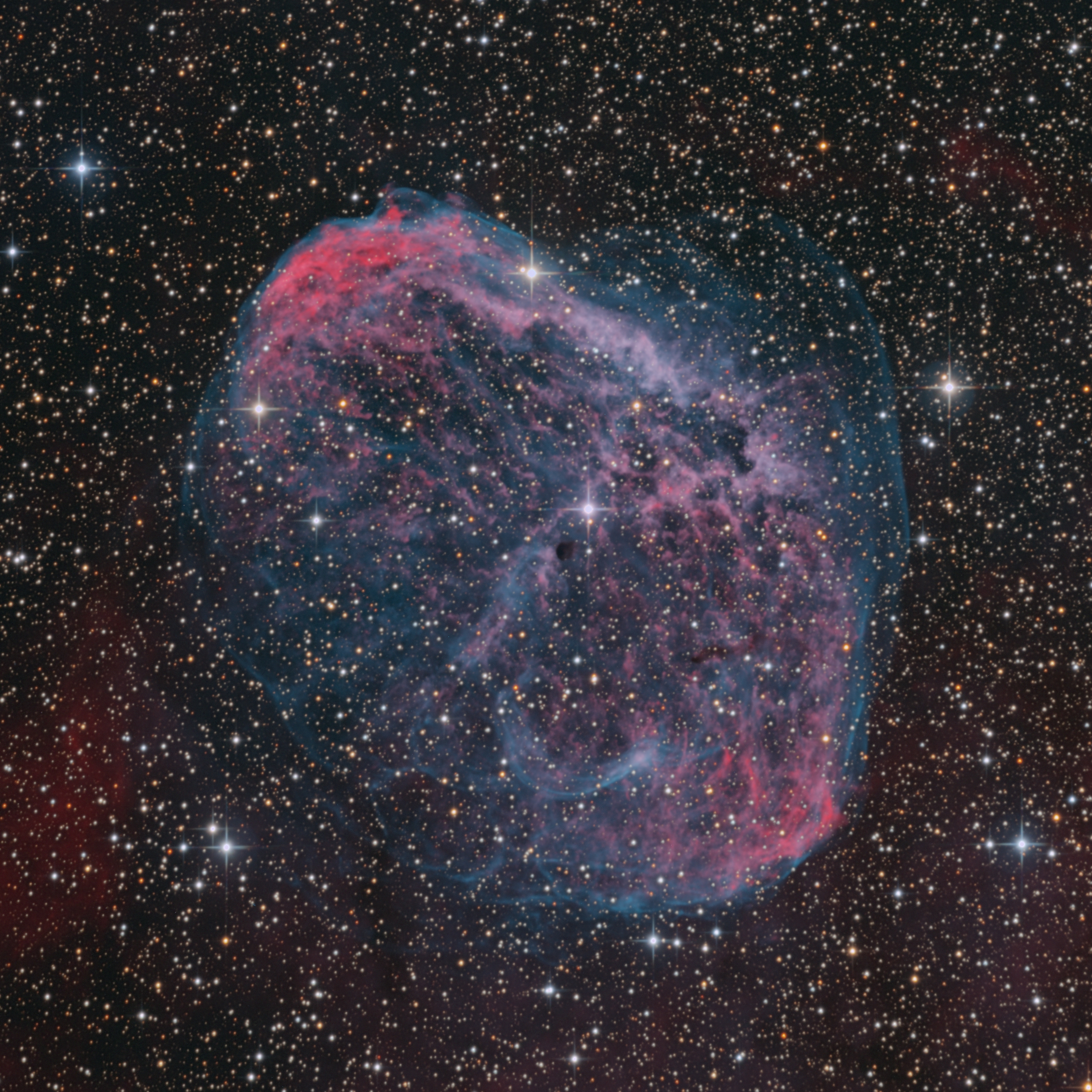 Der Crescent-Nebel, oder auch Sichelnebel ist ein beliebtes Objekt bei beginnenden und fortgeschrittenen Astrofotografen in den Sommermonaten.Üblicherweise dominiert das H-Alpha-Rot in den Aufnahmen. Möchte man auch die feinen (bläulichen) Filamente des Sauerstoffs darstellen sind umfangreiche Belichtungszeiten erforderlich. (H-Alpha 12 x 900s und OIII 34 x 900s, RGB 12 x 300).