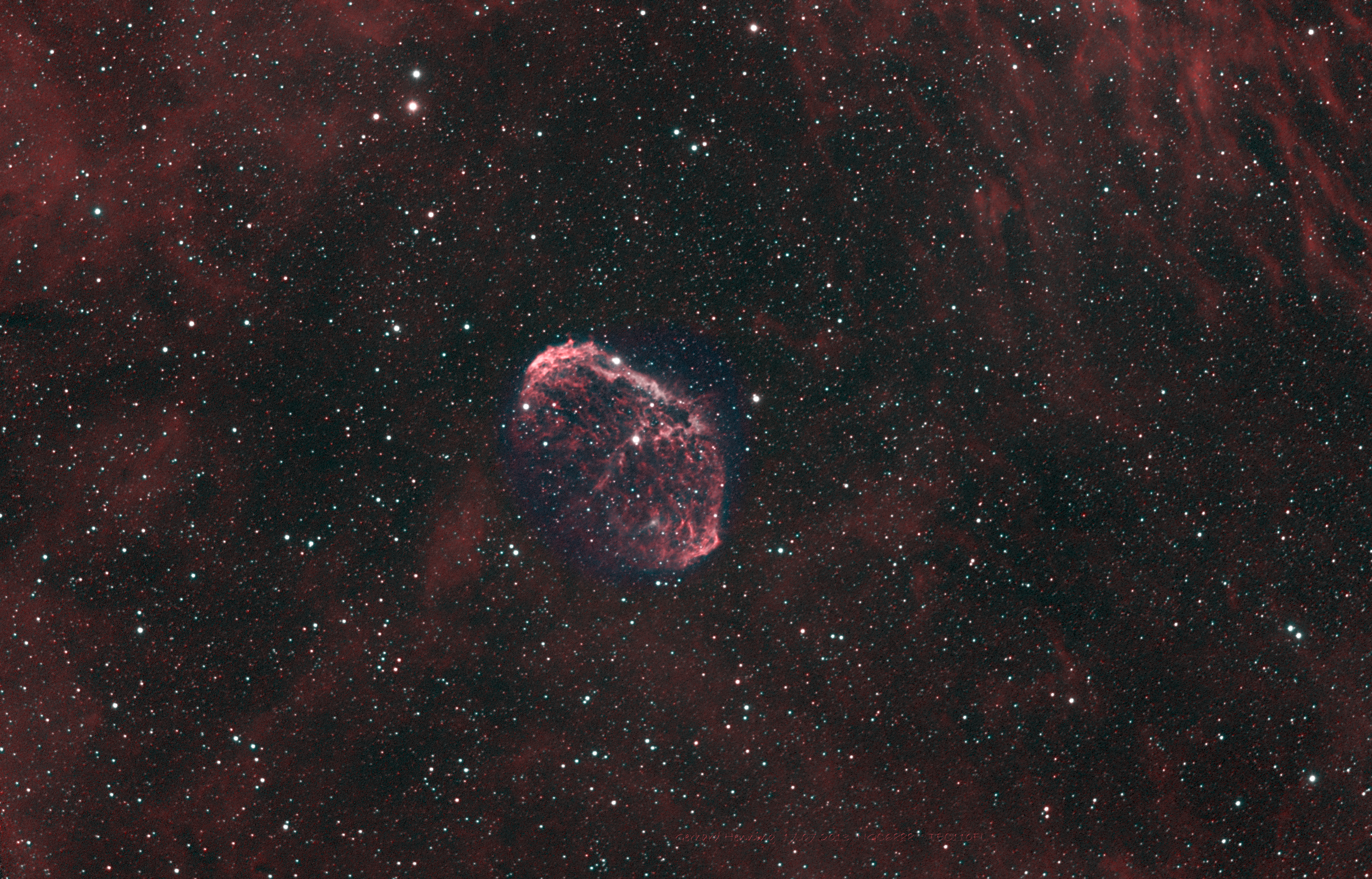 Der Crescentnebel ist ein Emissionsnebel im Sternbild Schwan, welcher ca. 4700 Lichtjahre von der Erde entfernt ist. Es ist eine Bicoloraufnahme, die mit zwei speziellen Schmalbandfiltern entstand. Der rote Hintergrund entsteht durch ionisierten Wasserstoff.