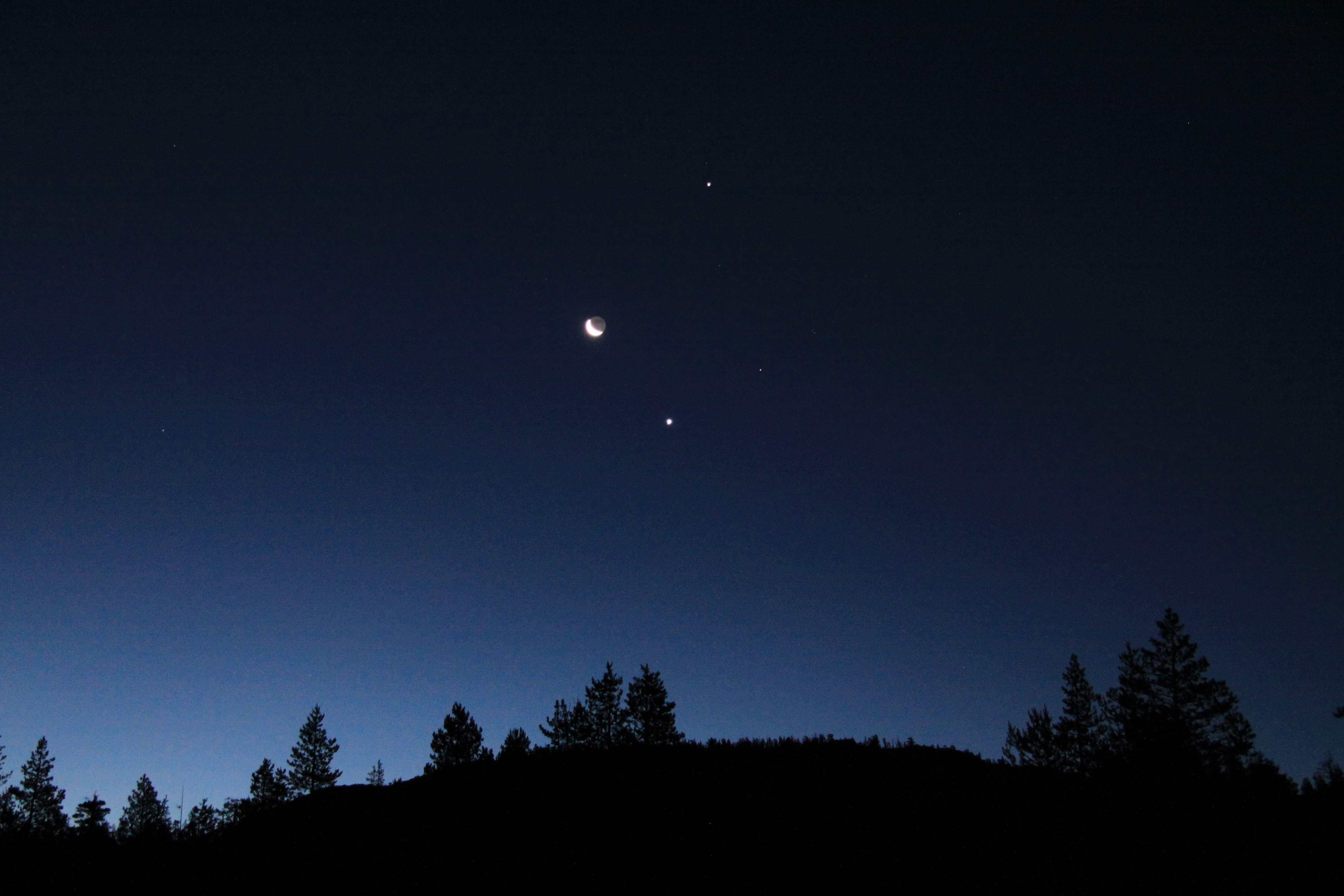 Während eines Urlaubs in den USA fiel mir morgens kurz vor 5:00 Uhr diese Konstellation aus Mond, Venus, Jupiter und Aldebaran auf, die ich als "Kreuz des Nordens" = Crux borealis bezeichne. Es handelt sich um das beste Einzelbild einer Serie frei Hand.