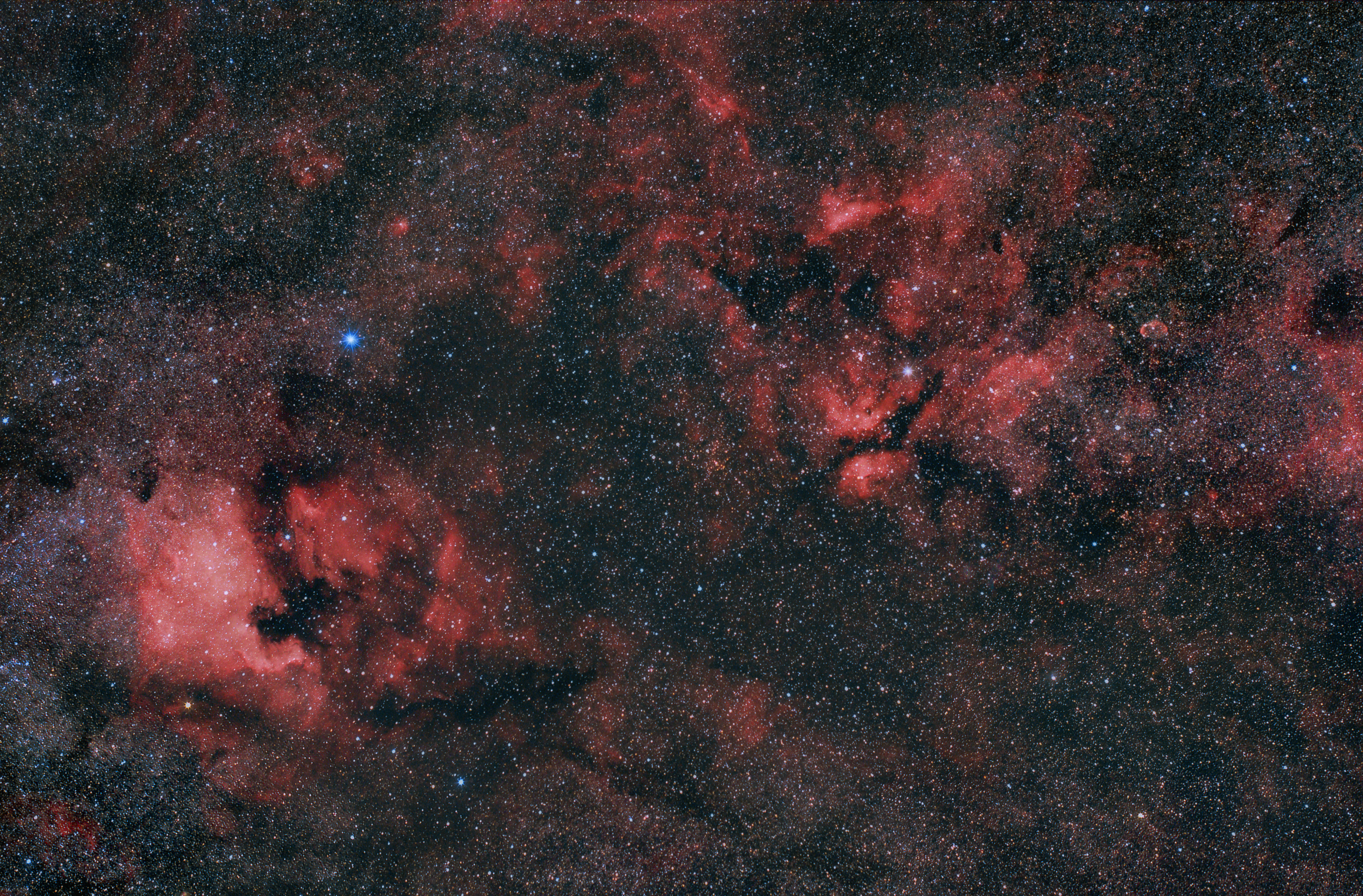 Diese Widefield-Aufnahme der riesigen roten H-Alpha-Wolken im Sternbild Schwan reicht vom Nordamerikanebel links über den Schmetterlingsnebel bis zum kleinen Mondsichelnebel rechts im Bild.