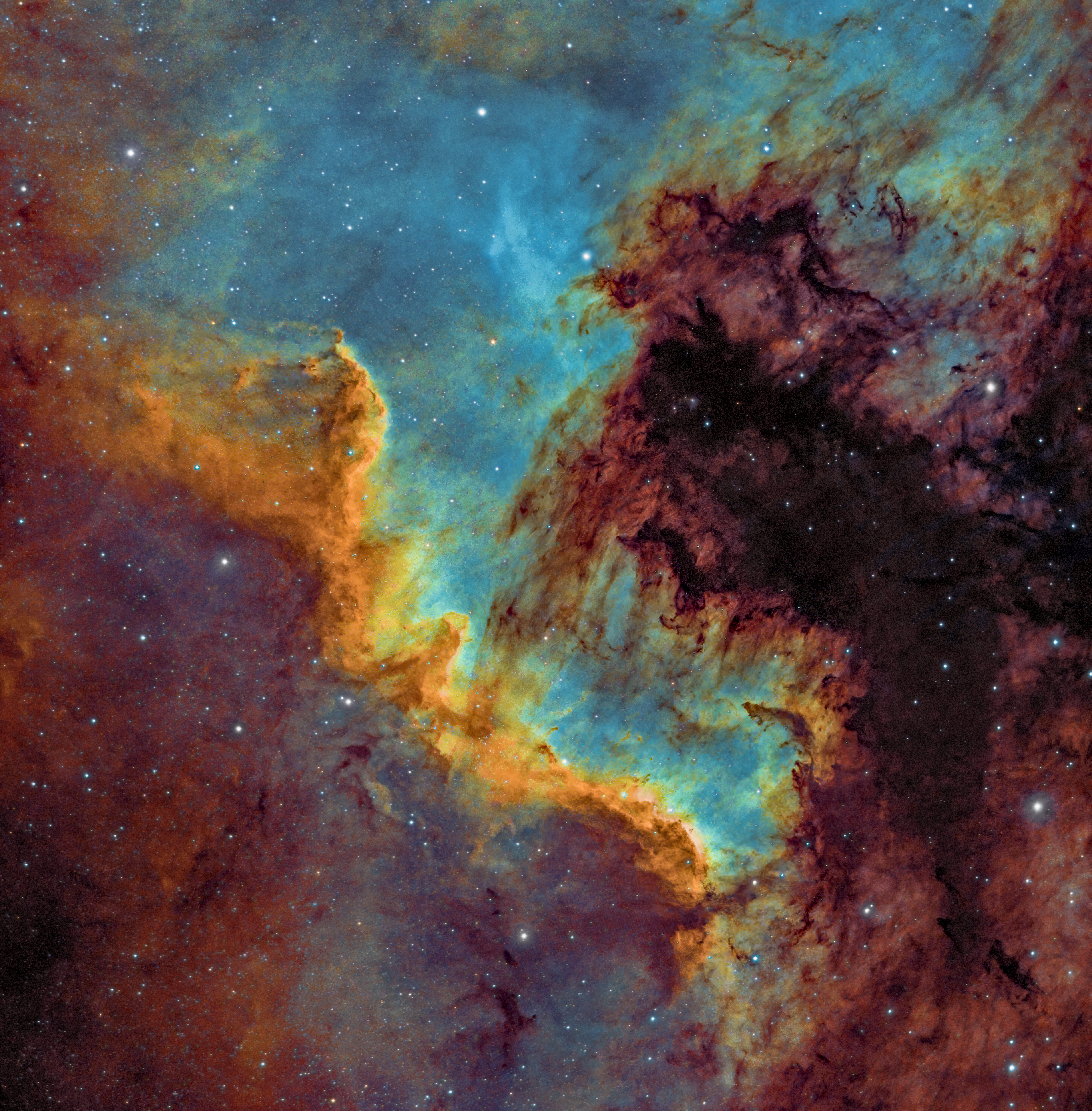 Zu sehen ist die Cygnus Wall, ein Teil des Nordamerikanebels NGC 7000. Die Entfernung zu uns beträgt etwa 2000 bis 3000 Lichtjahre. Dieser diffuse Gasnebel ist im Sternbild Schwan zu finden. Zur Aufnahme wurde ein Dualbandfilter verwendet.