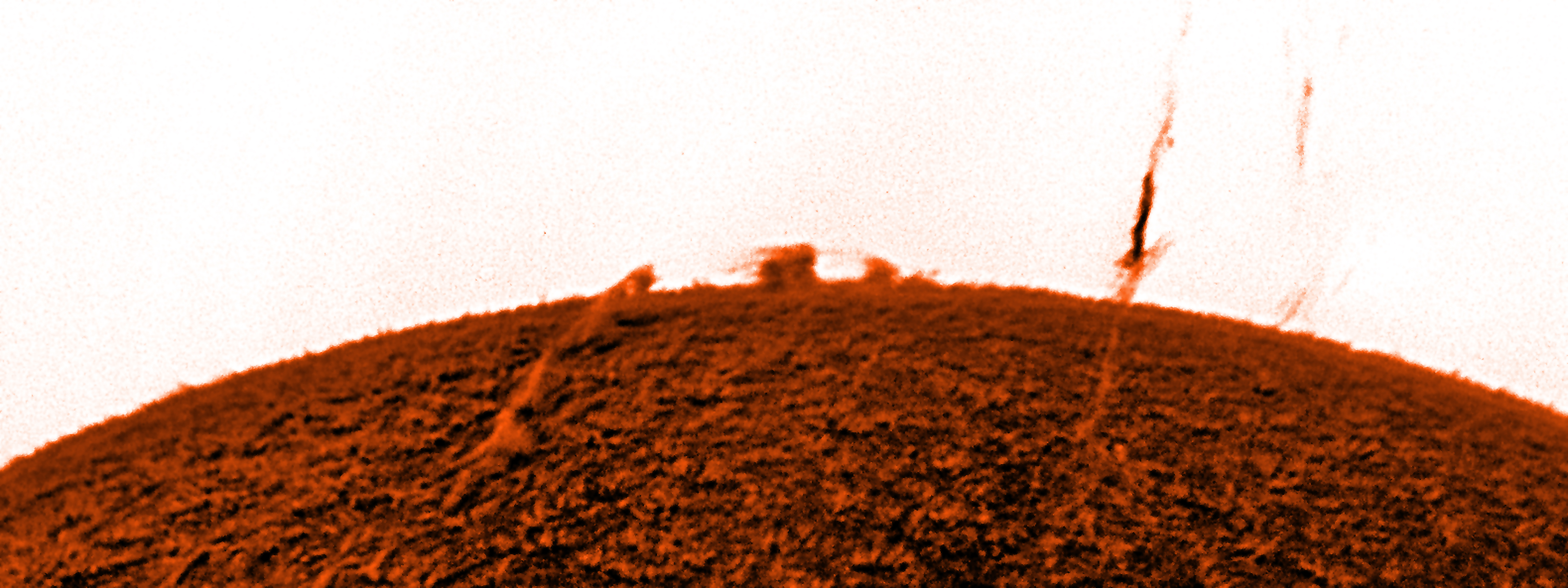 Am 14. Juni 2015 tauchte eine außergewöhnliche Protuberanz auf, die sich schnell wieder auflöste. Mir gelangen zwischen 9:40 und 9:50 Uhr einige interessante AVIs. Ein Foto zeigt schön den Übergang Filament-Protuberanz, besonders im Negativ.