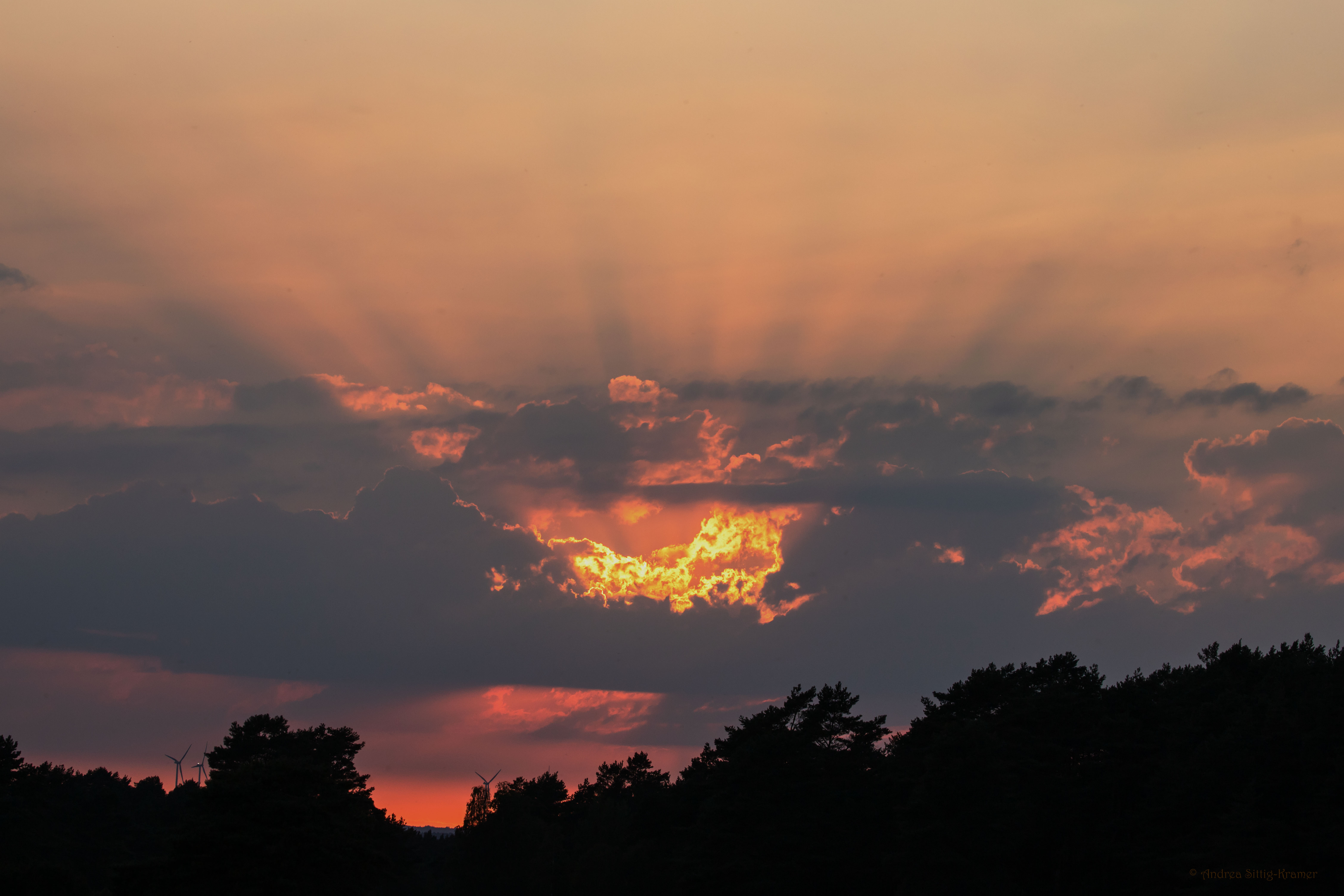 Am Abend des 20. August 2023 konnte ich im Landkreis Uelzen einen wunderschönen Sonnenuntergang beobachten. Die hohe Luftfeuchtigkeit (= viele Wassertröpfchen in der Atmosphäre) und lockere Wolkenbänder am Westhorizont bewirkten, dass sich intensive Strahlenbündel über der Sonne bildeten. Unser Zentralgestirn brachte die Wolkenränder scheinbar zum Leuchten, es sah für einen kurzen Augenblick so aus, als ob ein riesiges Feuer zwischen den Wolken lodert. Ein spektakulärer, farbenprächtiger Anblick!
