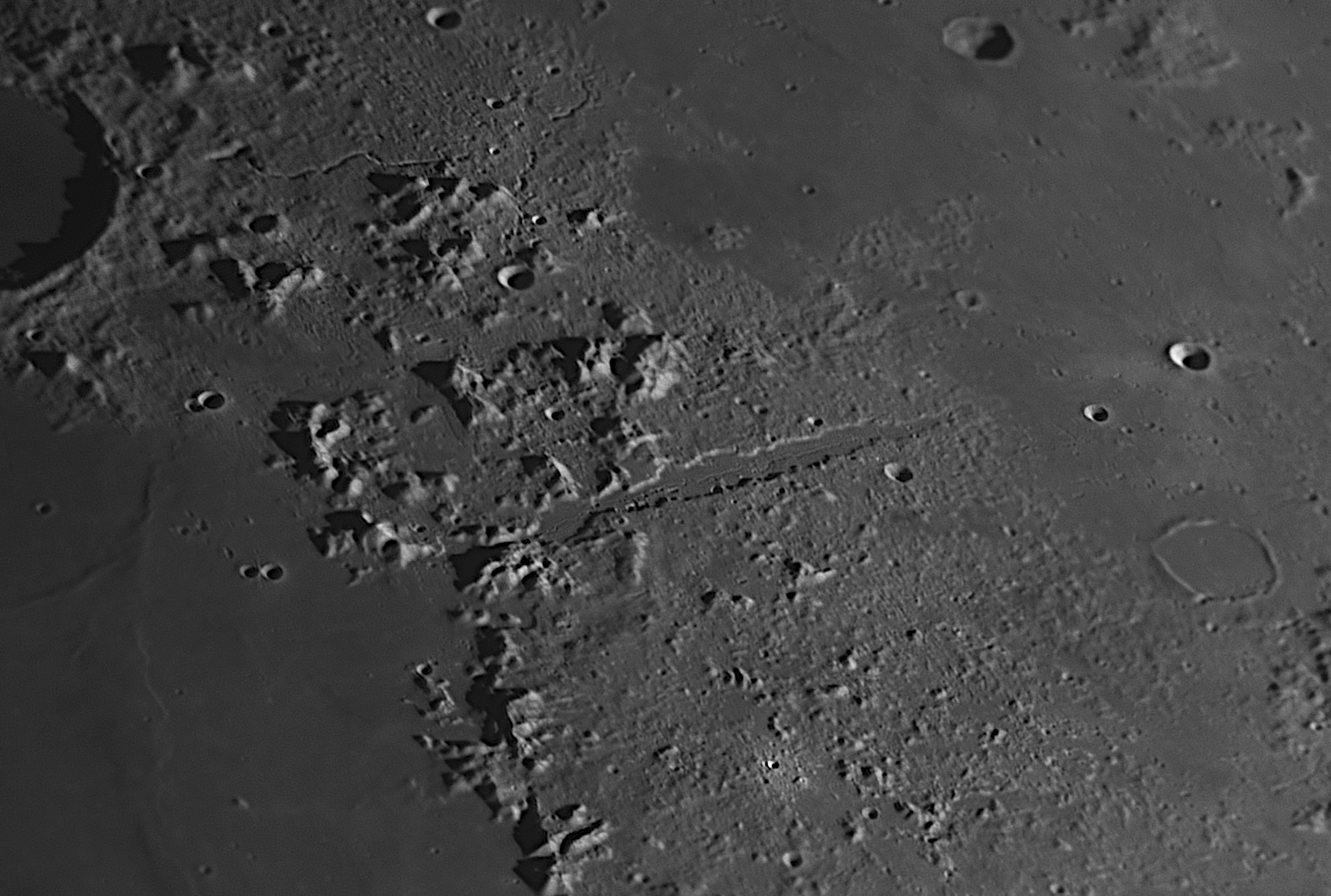 Bei relativ gutem Seeing, guter Transparenz des Himmels und optimalen Lichtverhältnissen auf dem Mond zur Zeit der Aufnahme, gelang mir diese Impression vom Alpental östlich des Kraters Plato. Das Tal durchquert die Mondalpen mit einer Länge von rund 170 Kilometern und einer Breite von etwa 10 Kilmetern. Die Rille selbst im Tal hat eine Breite von rund 700 Metern. Auch sind viele Kleinstkrater im Tal gut auszumachen!