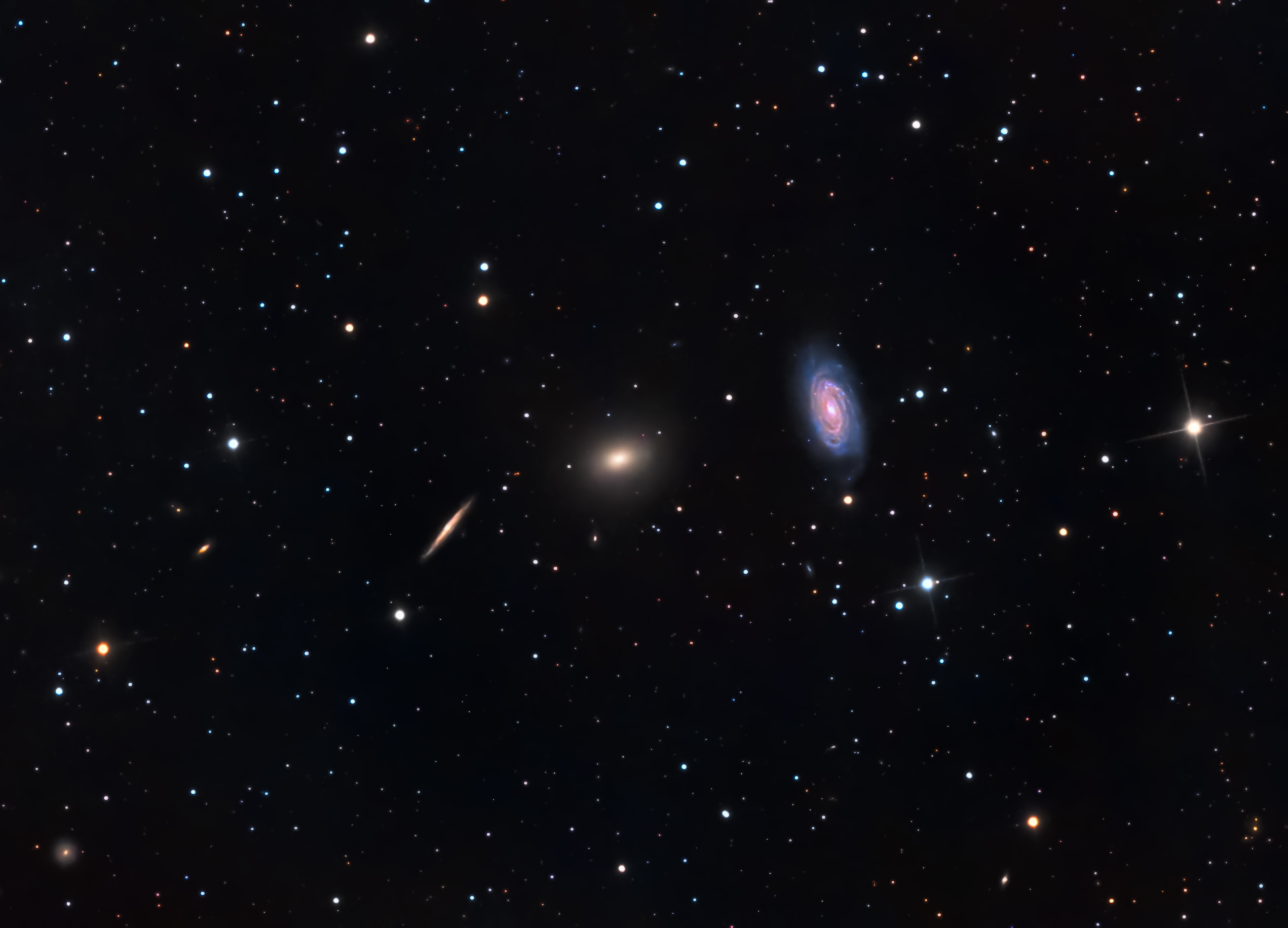 Innerhalb des Sternbilds Drache befindet sich ein Galaxienhaufen, dessen hellste Komponenten (NGC 5985, NGC 5982 und NGC 5981) die als Draco-Triplett bekannte Gruppe bilden. Diese besteht aus zwei vergitterten Spiralgalaxien und einer elliptischen Galaxie, die alle im selben Feld sichtbar sind, sogar bei weiteren Brennweiten als meiner. Es ist ein seltener und schöner Anblick, sowohl zum Beobachten als auch zum Fotografieren. Langzeitbelichtungsfotografie zeigt, dass es im Bereich des Drachentripletts Hunderte von anderen fernen Galaxien gibt, ein wahrer Haufen, der hundert Millionen Lichtjahre von uns entfernt ist.