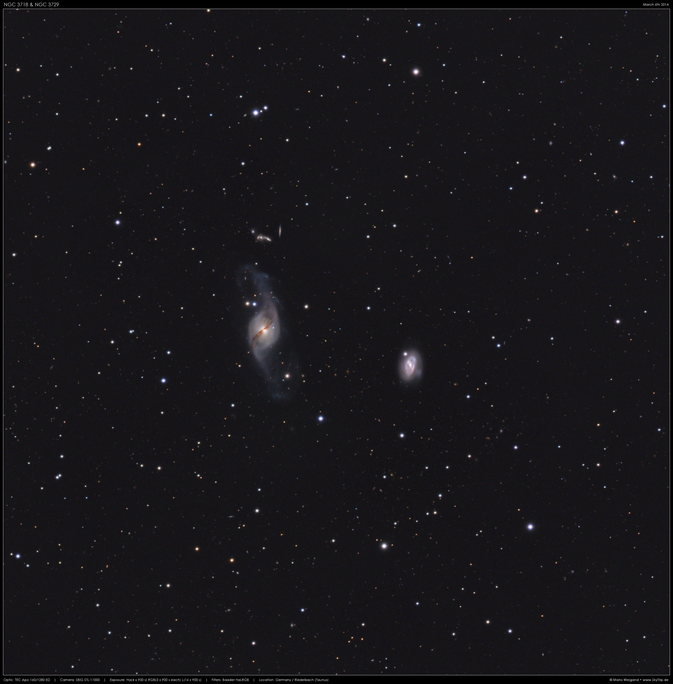 Das Sternbild Großer Bär ist im Frühling ein beliebtes Zeilgebiet für "Galaxienjäger". Knapp südlich der Verbindungslinie Phecda-Merak findet man das Galaxienpaar NGC 3718/3729. Beide sind Balkenspiralgalaxien vom Typ SBa und interagieren miteinander. Insbesondere NGC 3718 wirkt als Folge dessen merkwürdig verdreht. Mit auf dem Bild ist auch die kompakte Gruppe Hickson 56, die deutlich weiter entfernt ist.