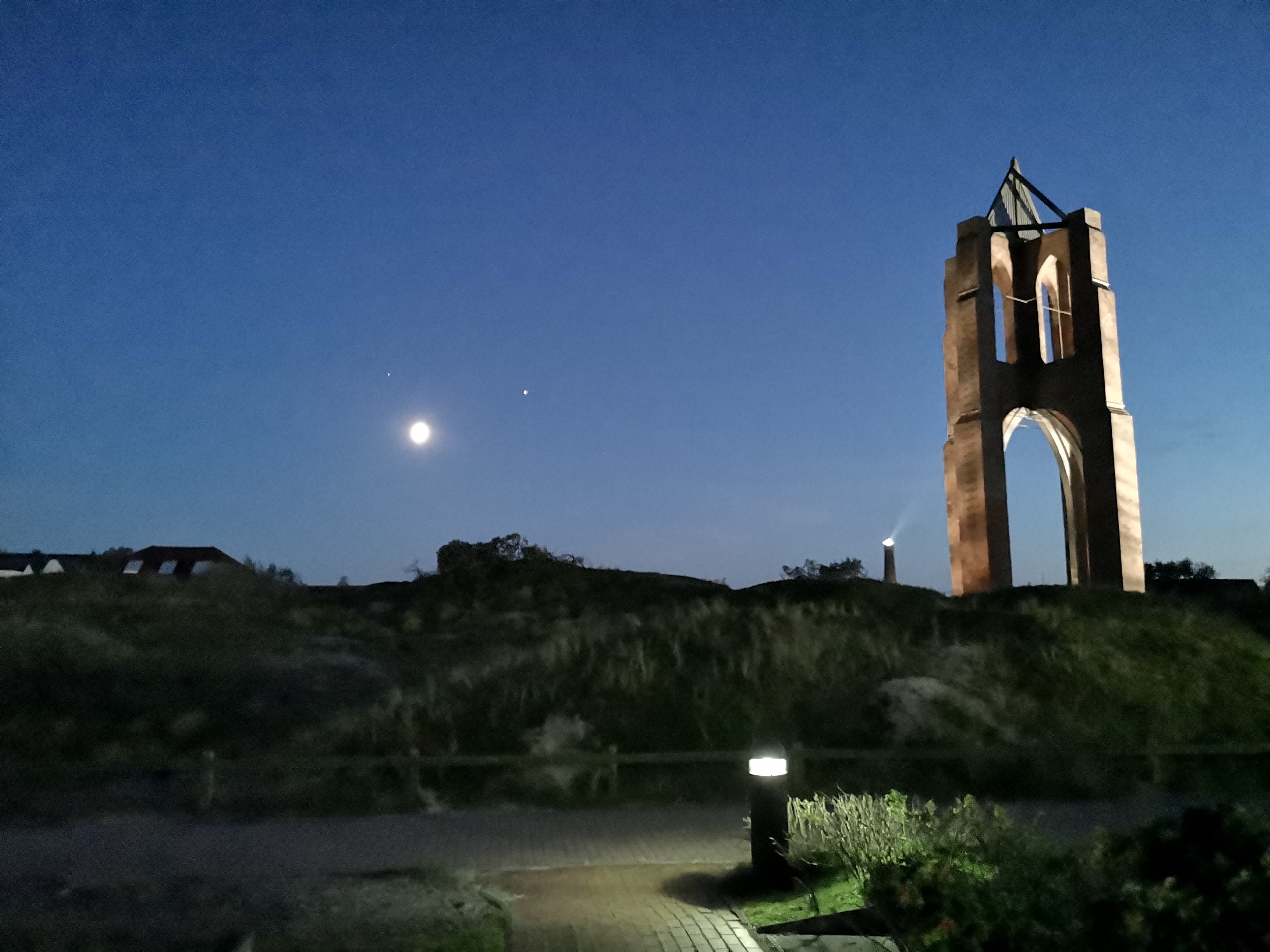 Beim Abendspaziergang auf der Nordseeinsel Borkum sind wir zum großen Kaap, ein Seezeichen für die Schifffahrt aus vergangenen Zeiten, gefahren. Mond, Jupiter und Saturn. Im Hintergrund der neue Leuchtturm von 1890.