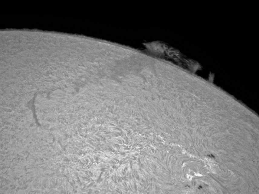 Jeder Starfighter hätte sich über einen der Jetstreams gefreut, die in der Atmosphäre zur Zeit der Aufnahme getobt haben ;-) - Es war, als würde man ein Bild direkt über einem Lagerfeuer machen. Ein Video hat aber dann doch die Aufnahme des langen Filamentes möglich gemacht. Es dreht sich gerade über den Sonnenrand. Schade, dass es bald weg ist, hatten wir doch gehofft, dass es instabil wird und einen Massenauswurf verursacht … Nun ja, zumindest lässt sich dadurch eine schöne Protuberanz sehen.