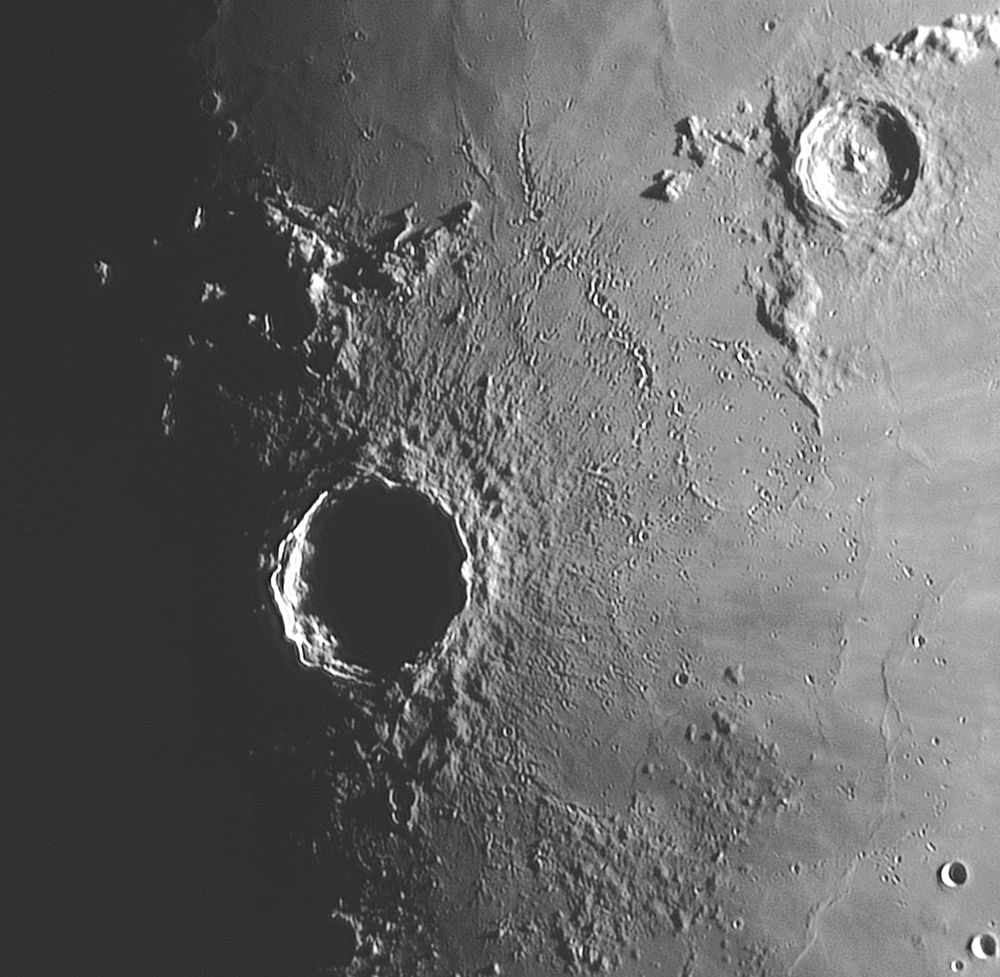 Gestern war ein seltenes Ereignis zu sehen: Das Mond-Quincunx. Direkt über Copernicus werden fünf Bergspitzen angeleuchtet, während der Rest noch im Schatten liegt. »Die fünf Augen des Würfels« (so aus dem Lateinischen übersetzt) konnte man gestern so sehen. Leider waren die Bedingungen nicht so gut, die Verwendung einer Barlowlinse war aufgrund der enormen Luftunruhe nicht möglich.