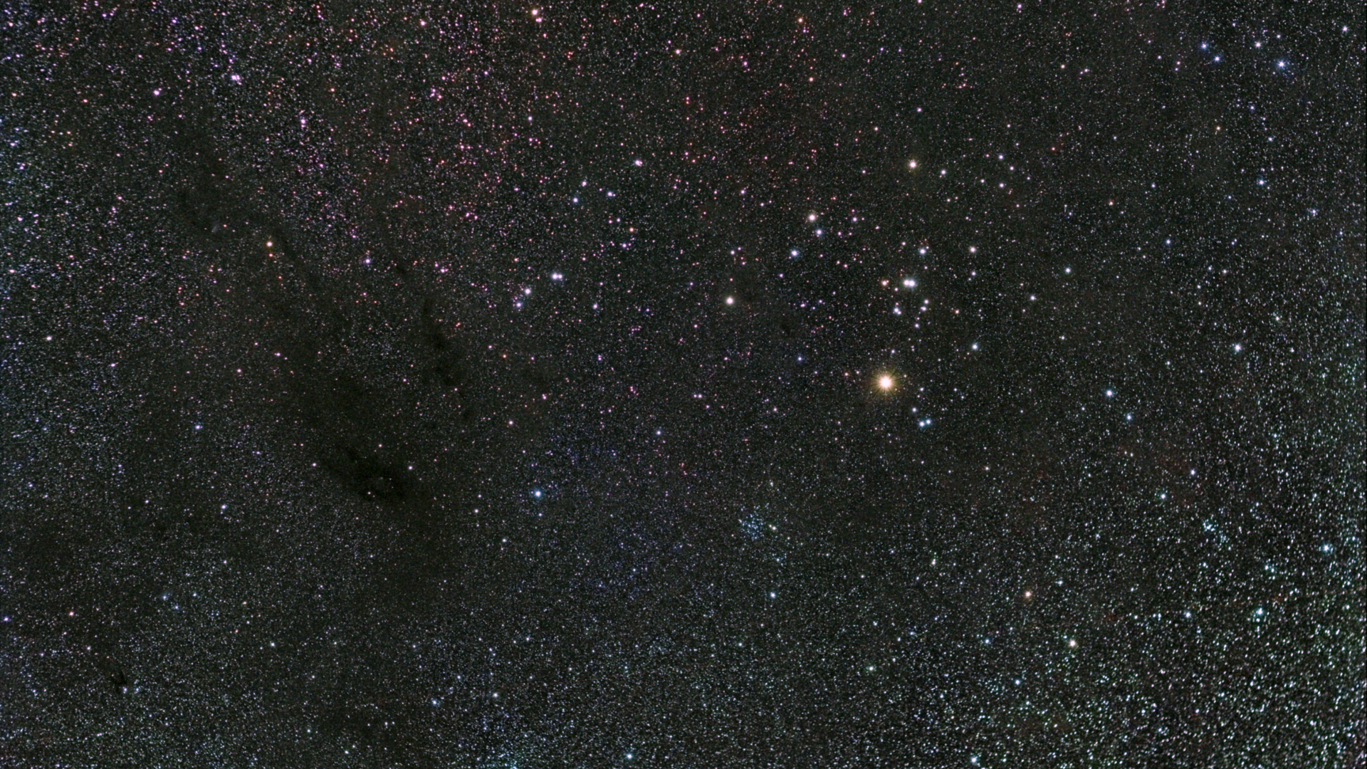 Der offene Sternhaufen der Hyaden, das Regengestirn im Sternbild Taurus, aufgenommen in der chilenischen Wüste. Neben den Hyaden sind in der Aufnahme auch noch der offene Sternhaufen NGC 1647 wie auch die Taurus-Dunkelwolken zu erkennen.