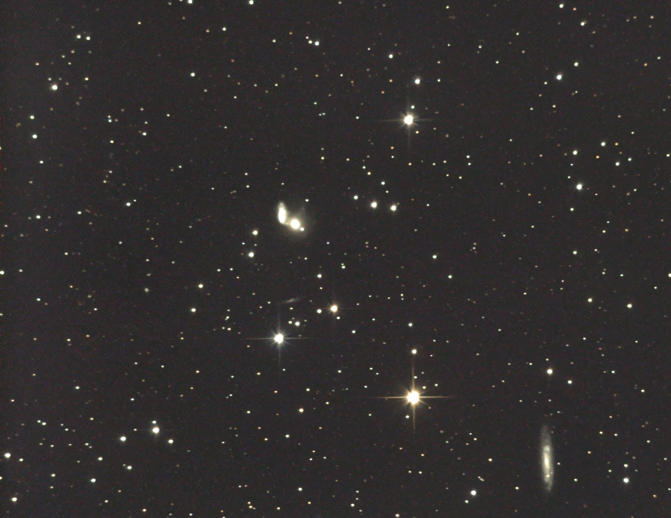 Nur drei Grad westlich von Beta Serpentis (Caput) finden wir dieses interessante System von wechselwirkenden Galaxien, das H. C. Arp in seinen »Catalogue of Peculiar Galaxies« unter die Nummer 91 aufgenommen hat in der Klasse »Spiralgalaxien mit einem großen Begleiter hoher Flächenhelligkeit auf einem Arm«. Beide Galaxien haben zusammen nur eine Ausdehnung von 1,7 Bogenminuten und ihre Entfernung beträgt 91 Millionen Lichtjahre. NGC 5953 (12,0 mag, Typ SO-a ) ist die südliche und zeigt einen Gezeitenschweif und eine Materiebrücke zu NGC 5954. Ihr wahrer Durchmesser beträgt rund 45000 Lichtjahre. Die nördliche NGC 5954 ist strukturiert (12,2 mag, Typ SBc/pec). Jede der Galaxien besitzt einen aktiven galaktischen Kern (AGN)! Detailreiche Aufnahmen gibt es vom HST und Sloan Digital Survey SDSS!! Das System wurde entdeckt von W. Herschel, am 17. April 1784, also heute genau vor 240 Jahren! Südwestlich erinnert die Galaxie NGC 5951 an die Sculptorgalaxie NGC 247. Ihre Helligkeit beträgt 12.9mag,Typ SBc, 3,6 x 0,8 Bogenminuten, linear 85000 Lichtjahre, in 82 Millionen Lichtjahren Entfernung.