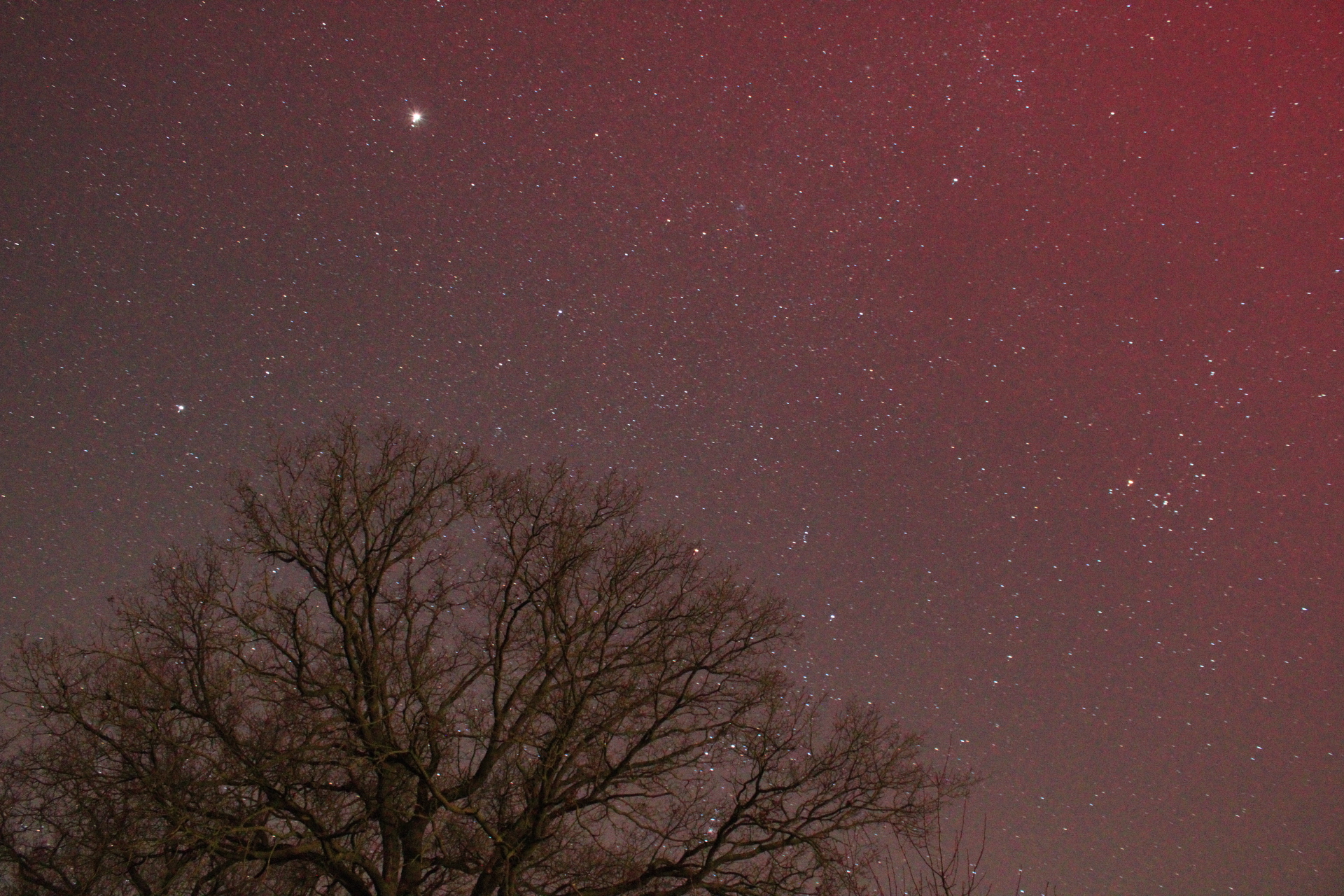 Diese Weitwinkelaufnahme vom 19. Januar 2026 dokumentiert die Auswirkung eines G4-Sonnensturms über Mitteleuropa. Der Planet Jupiter - das Sternbild Orion (Himmelsjäger) sowie der Stier (Taurus ) und seine Haufen.