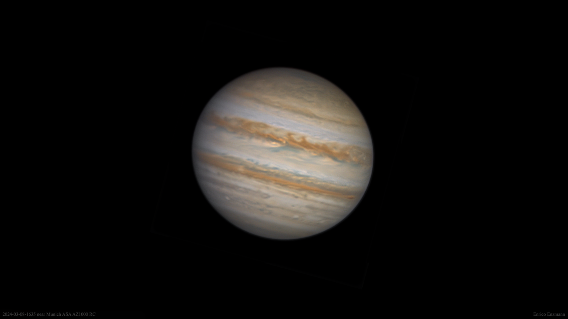 Dieses Bild ist wohl mein letztes Bild von Jupiter aus der aktuellen Sichtbarkeitsperiode aus Deutschland. Es wurde am 8. März 2024 gegen 17:35 Uhr Ortszeit gemacht und ist eigentlich eine Tageslichtaufnahme 45 Minuten vor Sonnenuntergang. Jupiter ist nun fast maximal klein mit nur noch 35 Bogensekunden Durchmesser und das Seeing war bei der Aufnahme sehr bescheiden. Erst wollte ich diese Aufnahme deswegen gar nicht rechnen, da ich hoffte, dass noch was Besseres nachkommt, aber das Wetter hat hier bis heute keine weiteren Aufnahmen mehr ermöglicht. Somit bleibt dieses Bild wohl das letzte Bild von Jupiter, bis er etwa Mitte Juli 2024 wieder vor Sonnenaufgang sichtbar wird.