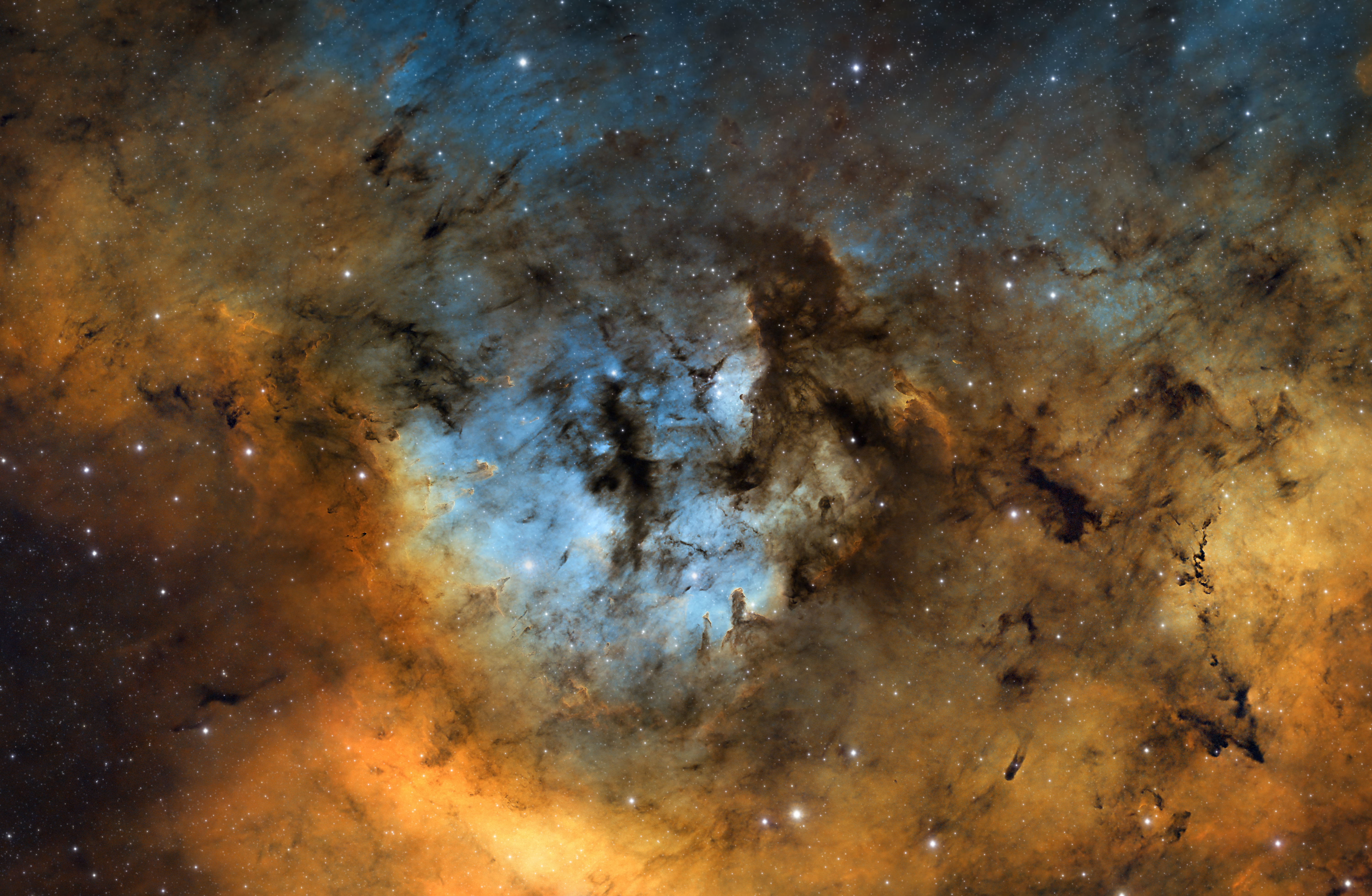 Als Teil des »Kosmischen Fragezeichens« sind CED 214 & NGC 7822 sehr bekannte Objekte im Sternbild Kepheus. In diesem Gebiet, das etwa 3000 Lichtjahre von der Erde entfernt ist, entstehen viele neue Sterne. Nachdem ich von diesem Bereich vor einiger Zeit eine Weitfeldaufnahme gemacht habe, hat es mich nun gereizt, anhand einer kompletten Neubearbeitung einen tieferen Blick ins Zentrum dieses Gebiets zu werfen, das durch seine Nebel und dunklen Staubbänder besticht. Ausgearbeitet habe ich das Bild in den Farben der Hubble-Palette (SHO).